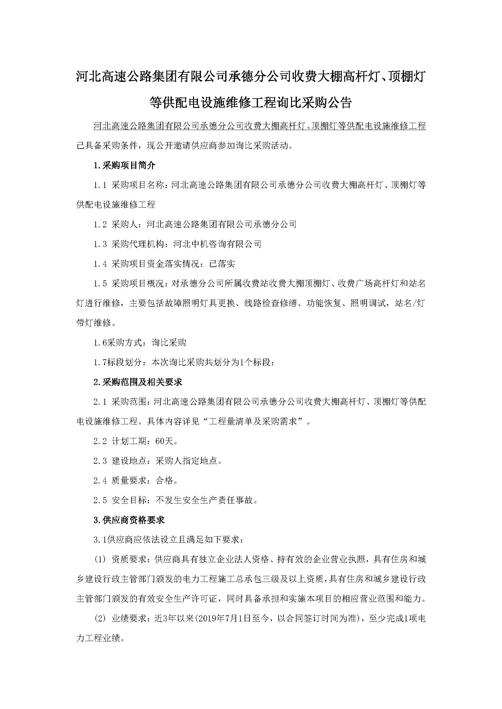 河北高速公路集团有限公司承德分公司收费大棚高杆灯、顶棚灯等供配电设施维修工程询比采购公告_页面_1