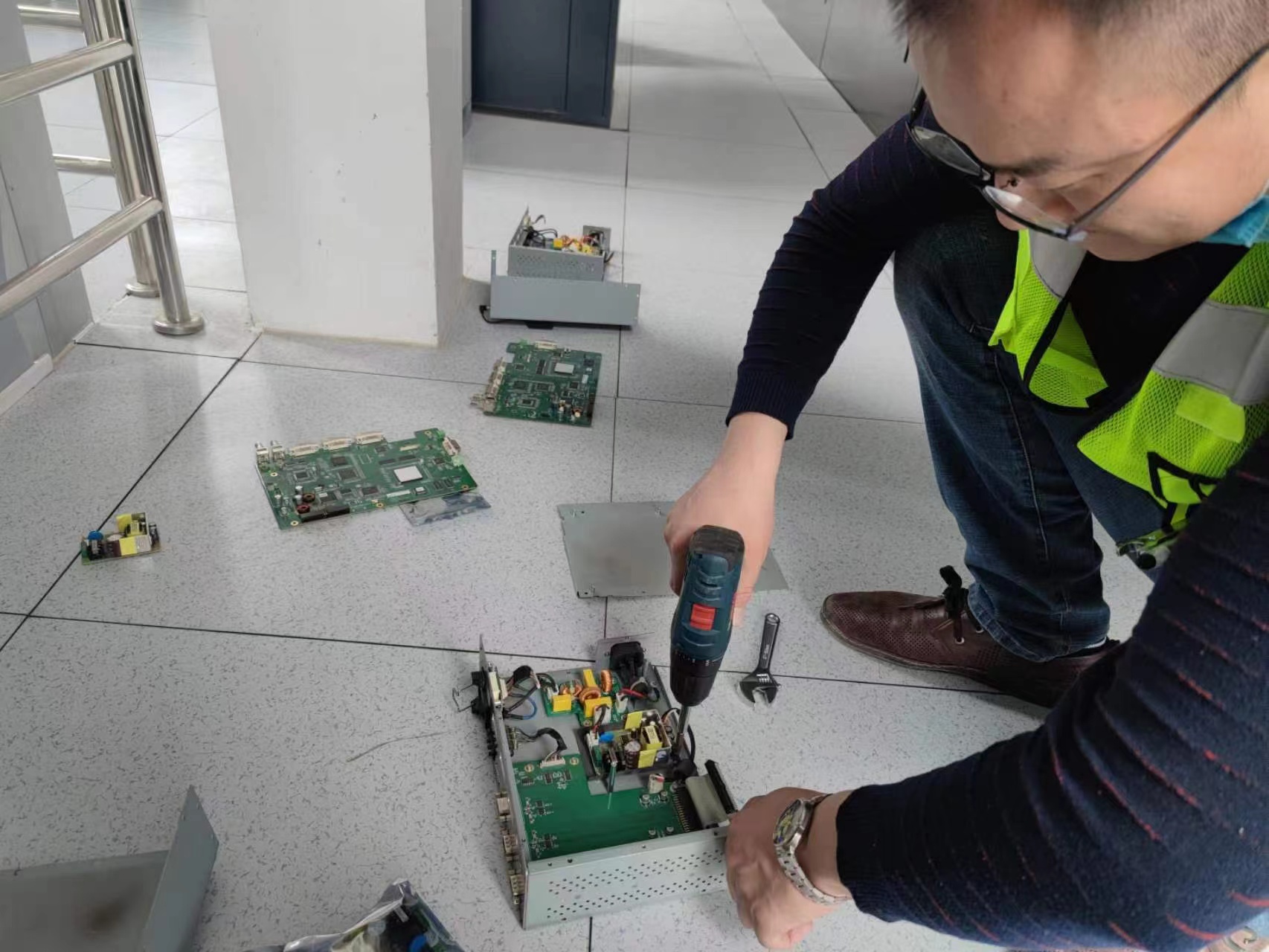 根据以往经验,维修人员重点对投影机主控盒设备进行排查,发现是主控盒内电源老化导致。如果直接返厂维修,不但价格贵,维修时间也很长,严重影响工作效率。锁定问题根源后,维修人员通过认真研究分析,并对电源模块进行拆卸检查。经过两个多小时的拆解、更换、重新安装后,DLP屏恢复正常使用,故障得以顺利排除,同时降低了一半的维修费用。