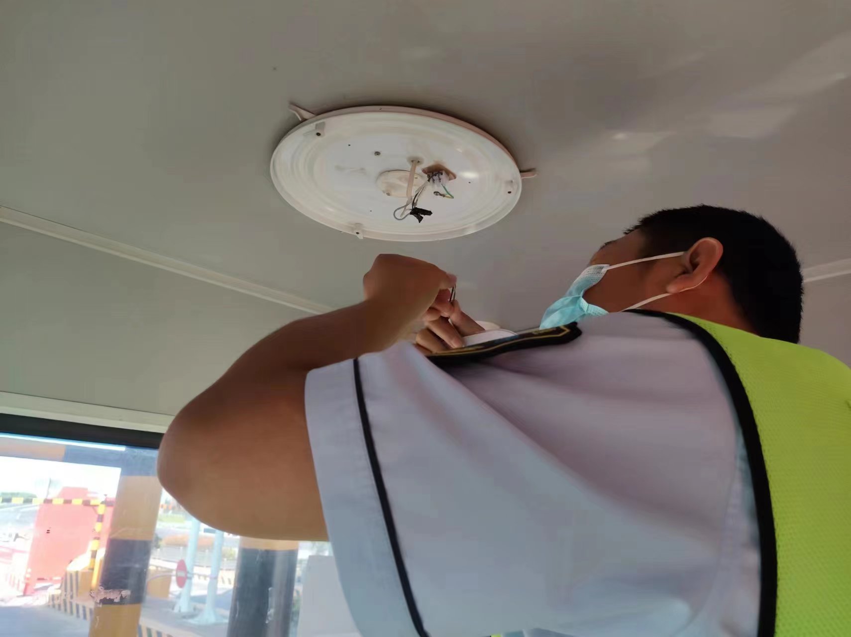 7月25日,大麻森收费站收费一班班长在岗巡查时发现003发卡车道岗亭照明灯不亮,于是上报值班站长,值班站长立刻通知机电人员对故障灯进行维修。