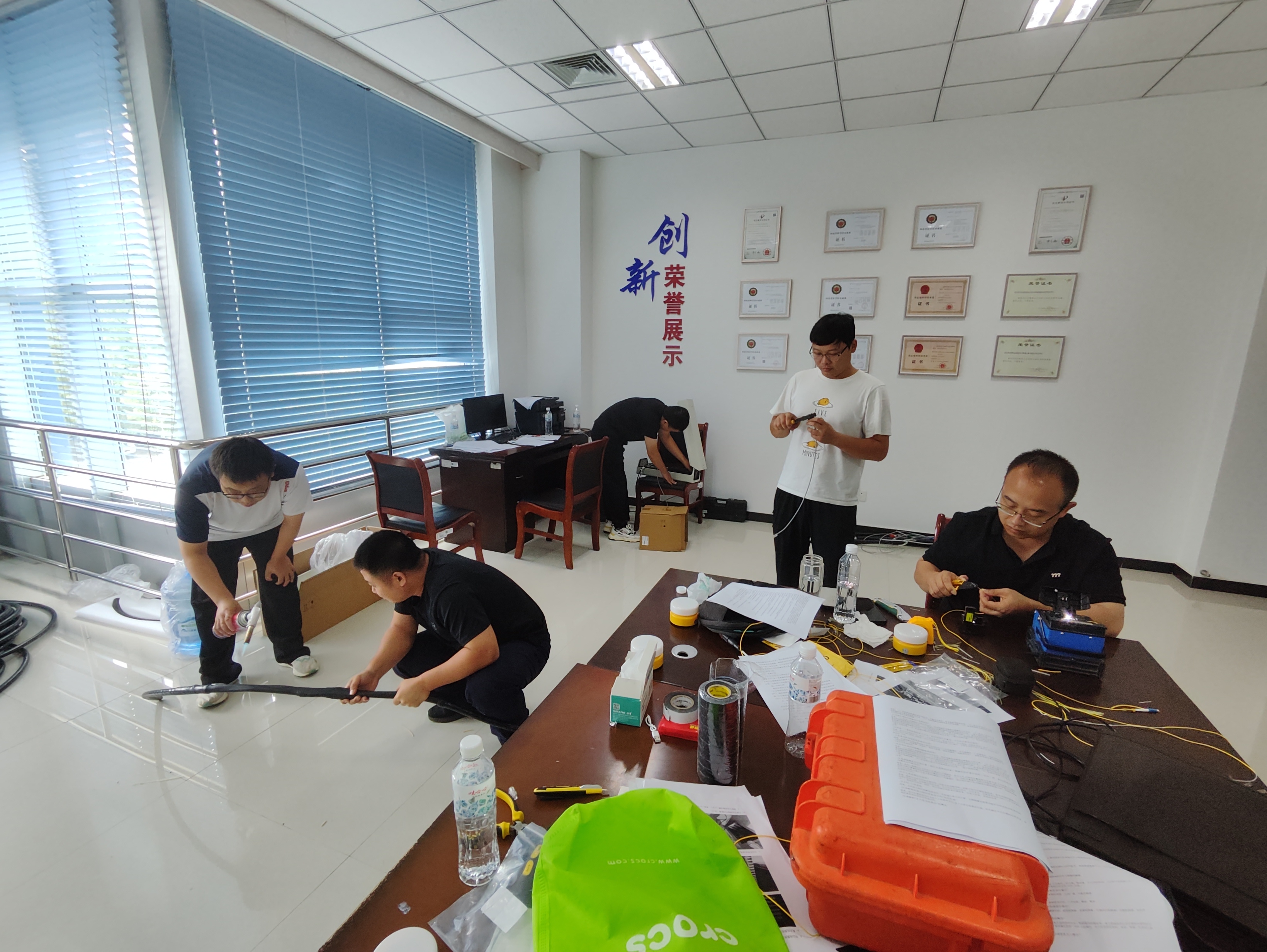 队员们在集中备战前,均已利用考试软件反复练习题库中所有考题,并仔细研究技能实操的每个环节,做到知己知彼,高效提升。参赛队员们集中后,首先进行了知识竞赛仿真练习,并随即模拟抢答比赛,高效完成了机电知识竞赛备战内容。随后针对技能实操中网线制作、光纤熔接、带铠电缆续接和抓拍摄像机调试的比赛内容,参赛队员们分别完成计时比赛,比赛进行时安排专人全过程旁站,并记录实操的不足点,做到赛后及时总结。
