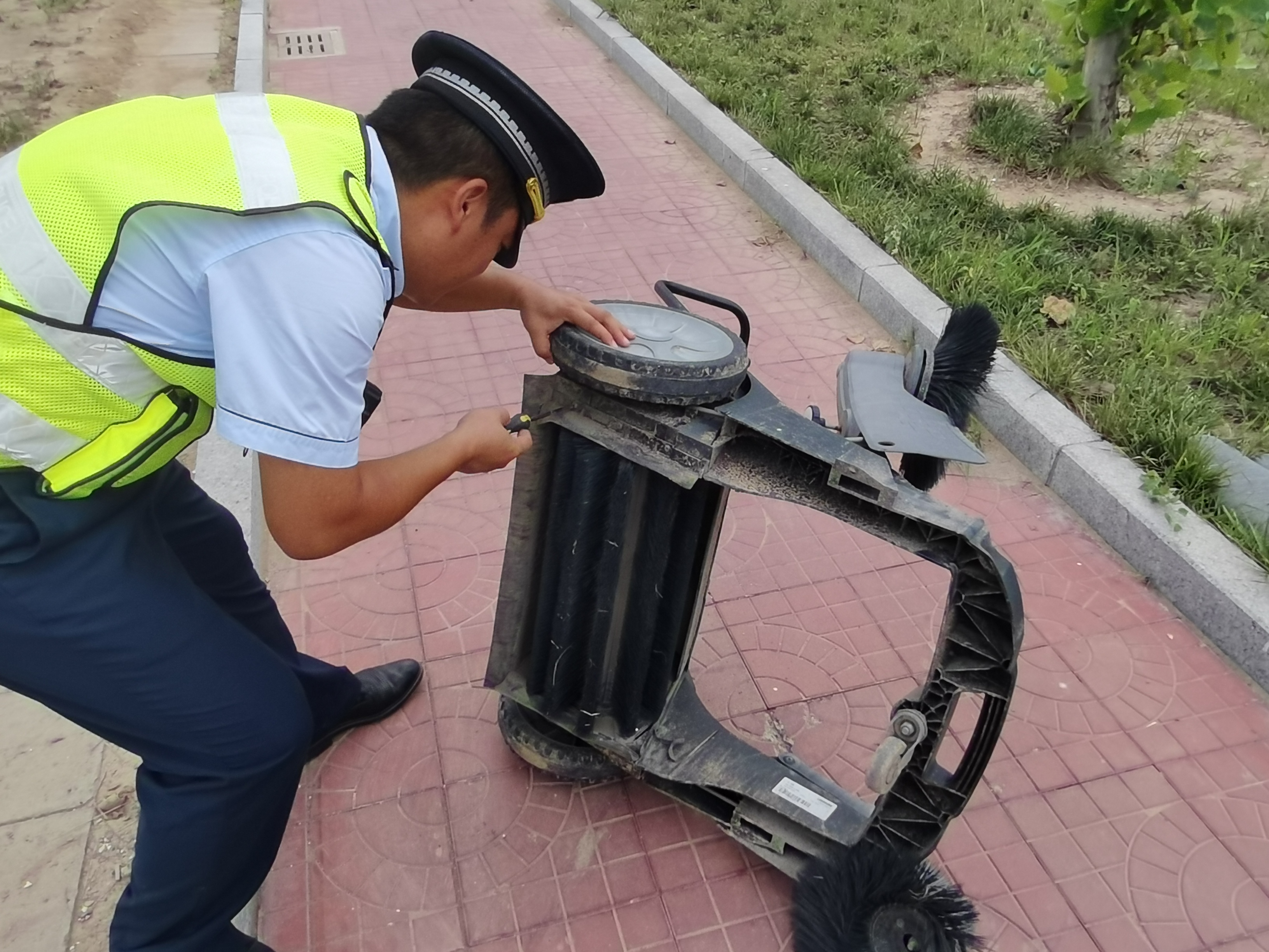当日,收费班长在进行收费广场卫生清扫时,发现手推式扫地机轮毂卡死无法推行,影响员工正常使用。经仔细检查,发现是石子卡住齿轮,造成轮毂卡死。在岗收费人员立即对扫地机进行拆解、,清理内部石子和污物,成功解决故障,扫地机恢复正常使用。