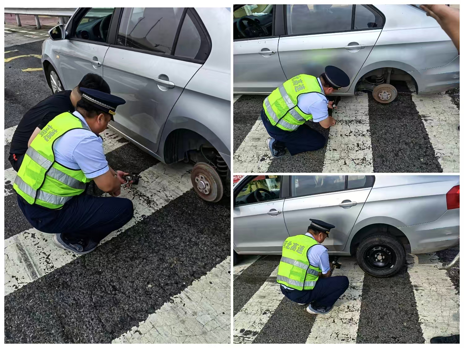 当时正在收费广场疏导车辆的收费班长赵斌第一时间发现险情,为避免后方车辆发生碰撞,保障通行安全,他迅速安排人员将后方车辆分流疏导至其他车道,高效避免了站口拥堵。此时,当事司机面正手足无措地到处张望,赵斌一边主动上前安抚司机情绪,一边提出帮忙更换备胎。只见他熟练地拿出工具,弯腰俯身操作,拆旧胎、装备胎、紧螺丝,动作麻利有序,短短几分钟便成功帮司机换好了备胎。
