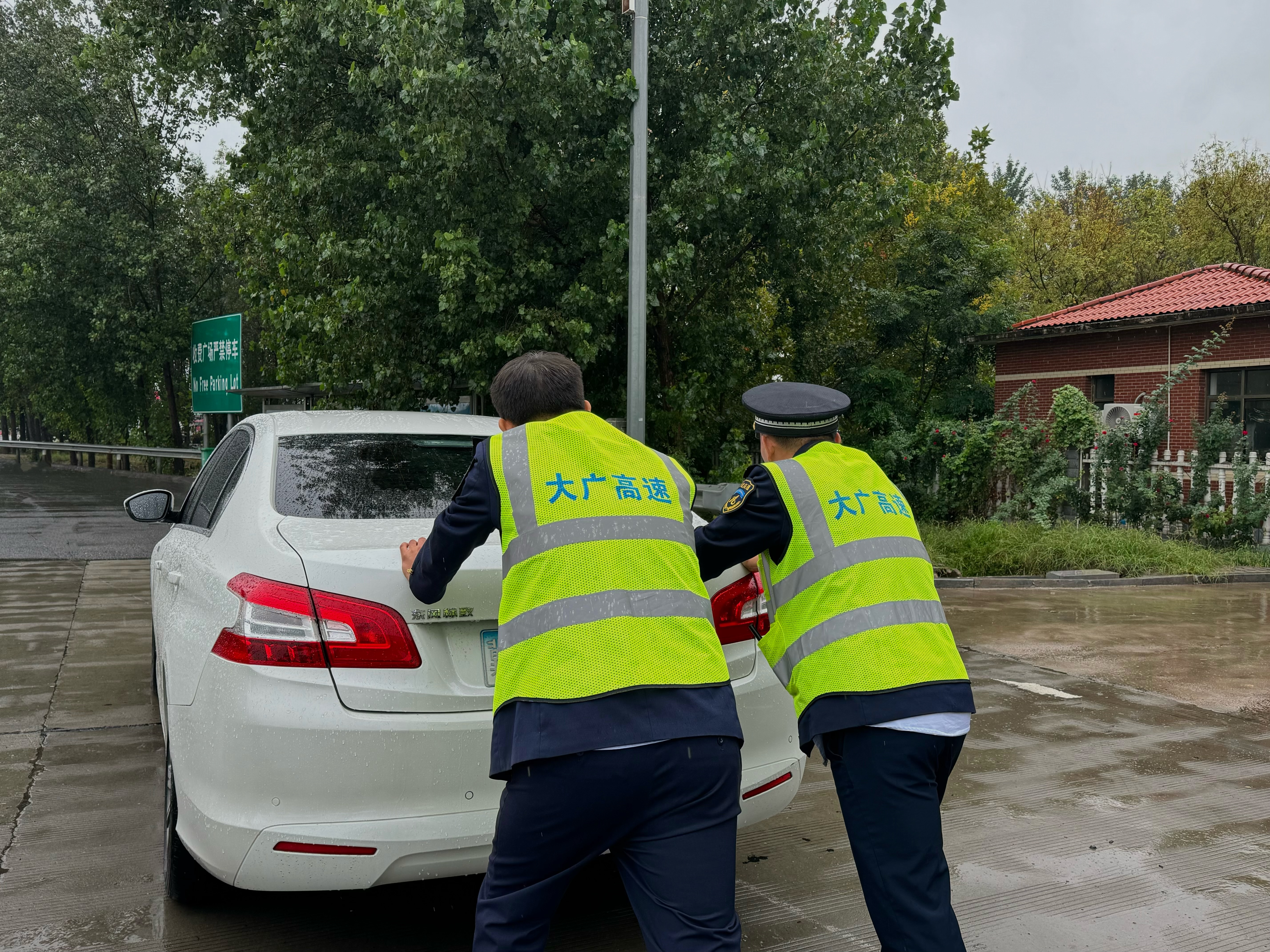 当班收费员发现险情后,立即上报当班班长。班长迅速响应,第一时间赶至故障车辆现场。此时雨势正猛,豆大的雨点密集洒落。为保障站口畅通与司乘安全,班长与疏导员毫不犹豫,并肩协作,不顾雨势,奋力抵住车身后侧,全力推动车辆。二人配合默契,在湿滑路面上稳步将车辆推至外广场安全区域,及时化解了道口拥堵风险。