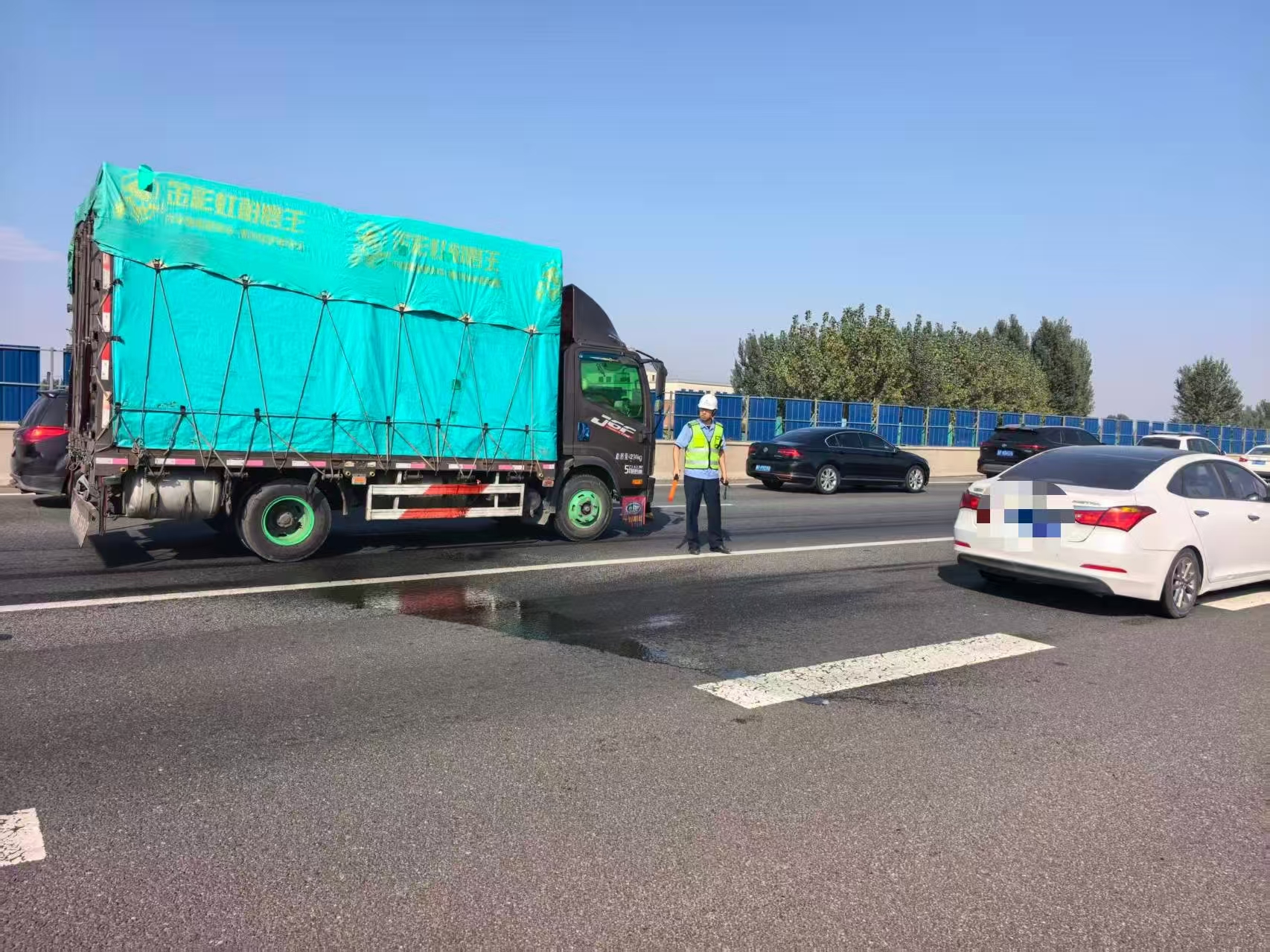 上午十时许,密云方向京雄互通附近车辆拥堵,正在执行预警任务的队员敏锐地发现一辆行驶中的货车不断有液体洒落,迅速通过高音喇叭提醒该车驾驶员注意。司机听到提示后,缓缓停车。检查发现是某处水管断裂,队员协助进行简单捆扎处置,车辆得以安全驶离。