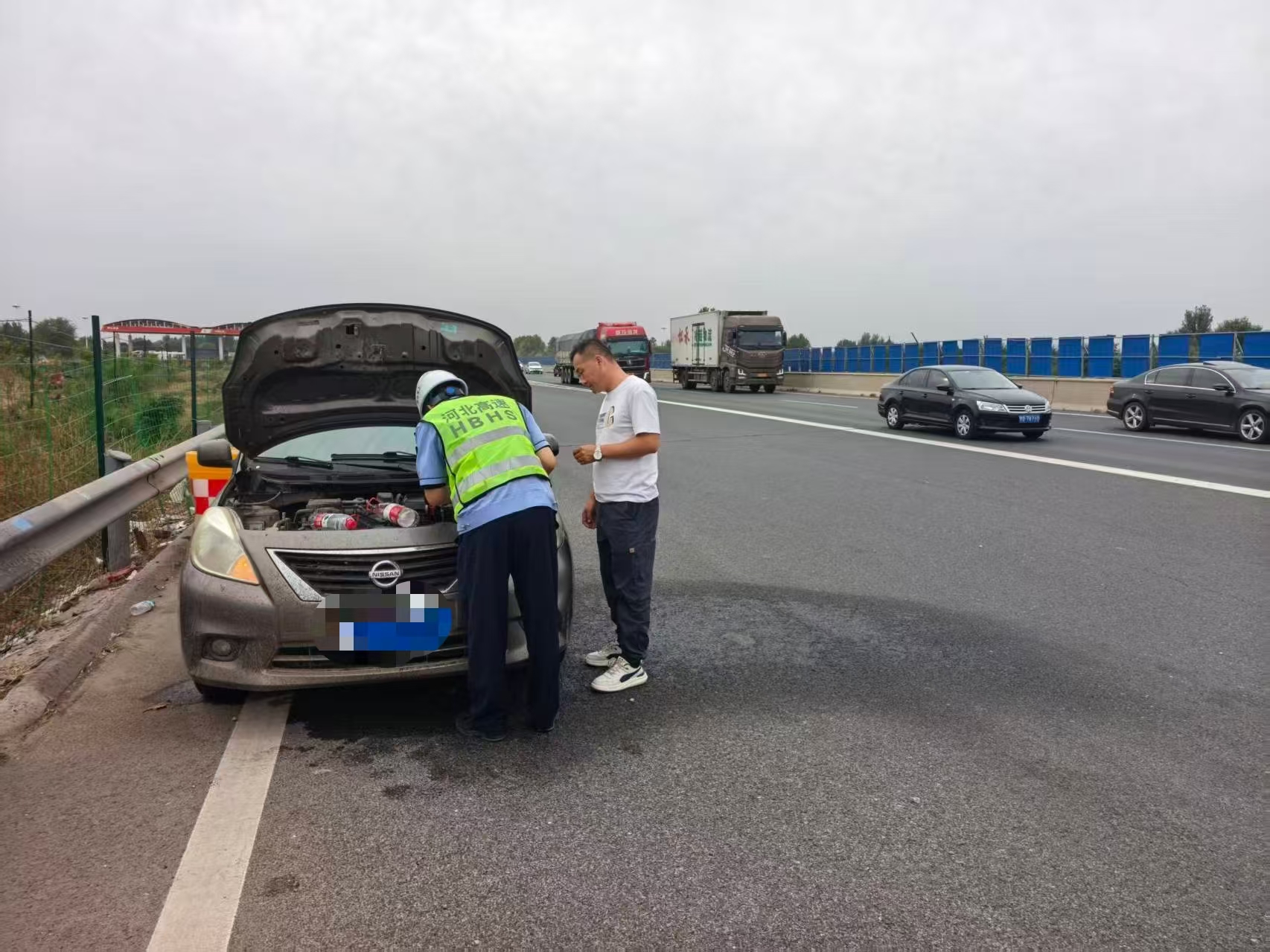 下午四点十分,在固安服务区南区出口附近,一辆轿车因防冻液泄漏导致水温过高而抛锚。巡查至此的队员主动上前了解情况,帮助司机购买矿泉水临时加注,并指引其至就近收费站下道维修。
