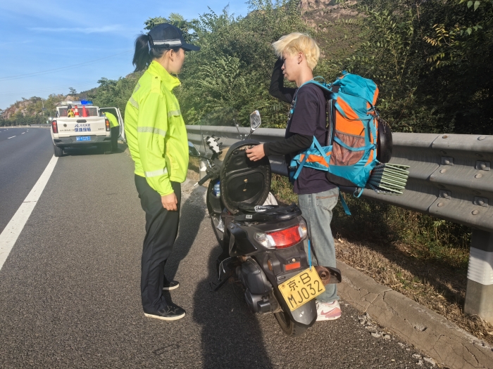 10月1日16时,安匠保通保畅应急大队巡查至承唐段承德方向K806时,发现一名男子正吃力地推着一辆摩托车前行,行车道车流急促,情况十分危险。