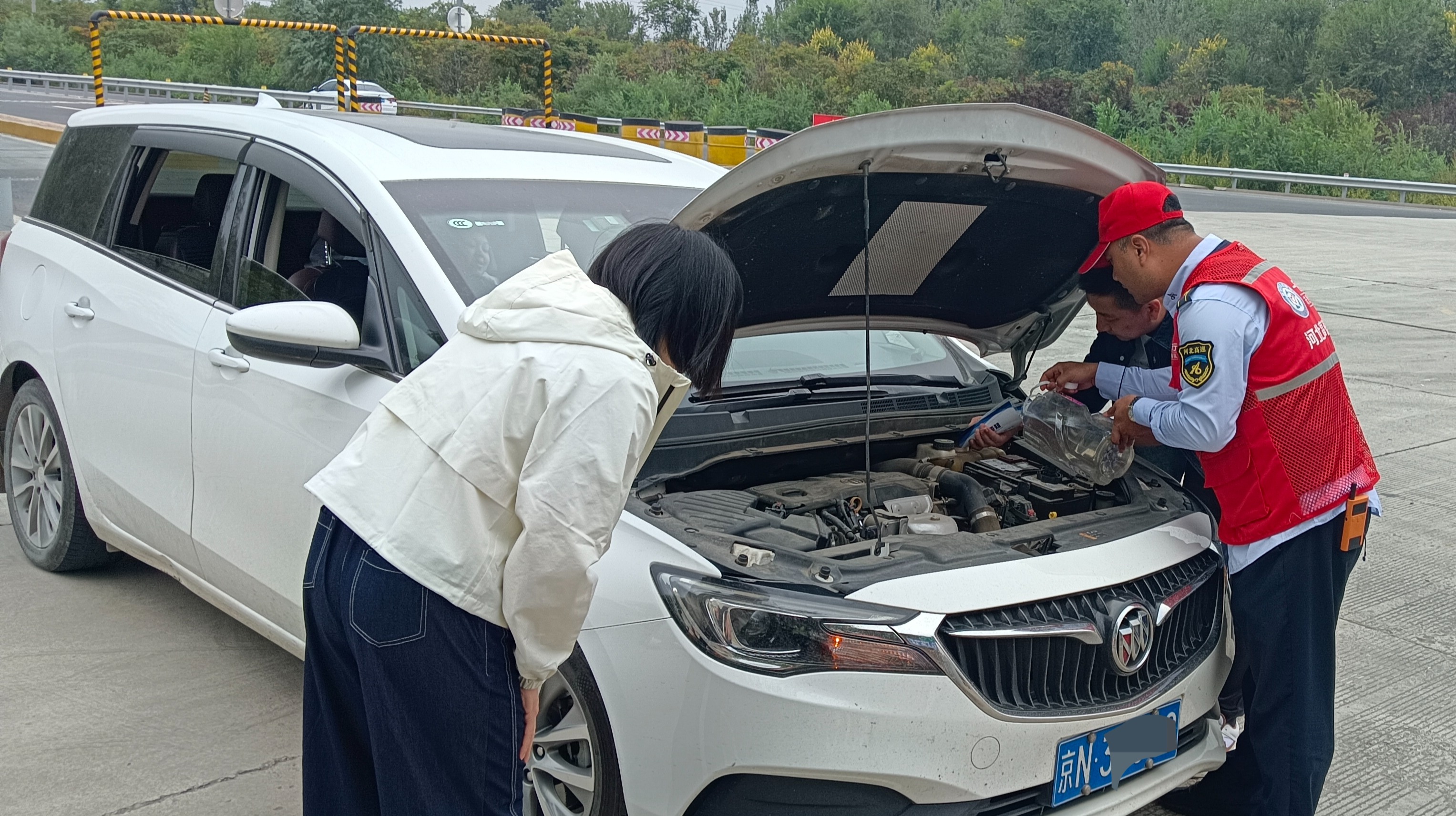 10月5日11时许,一辆白色别克轿车开启双闪,停靠在三河南收费站广场路边,司机神情焦急,在车旁来回踱步。收费员发现异常后,立即通知班长前往现场处置。