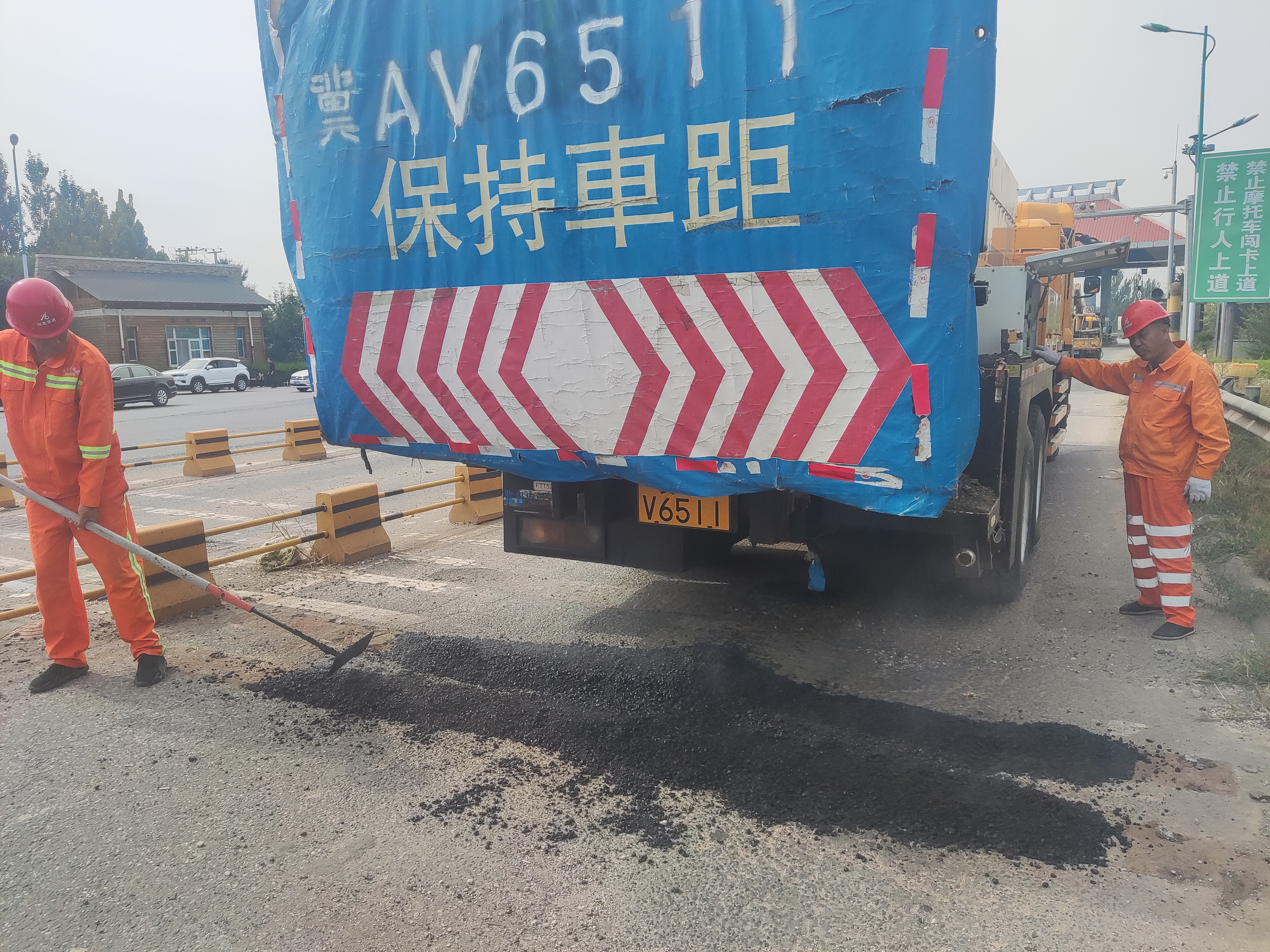接到通知后,饶阳养护队第一时间启动应急响应,养护队带班领导高度重视,牵头召开紧急部署会;结合现场病害情况制定精准抢修方案;同步调度备勤人员、调试沥青热再生设备等机械,确保人员、设备“随调随动”。