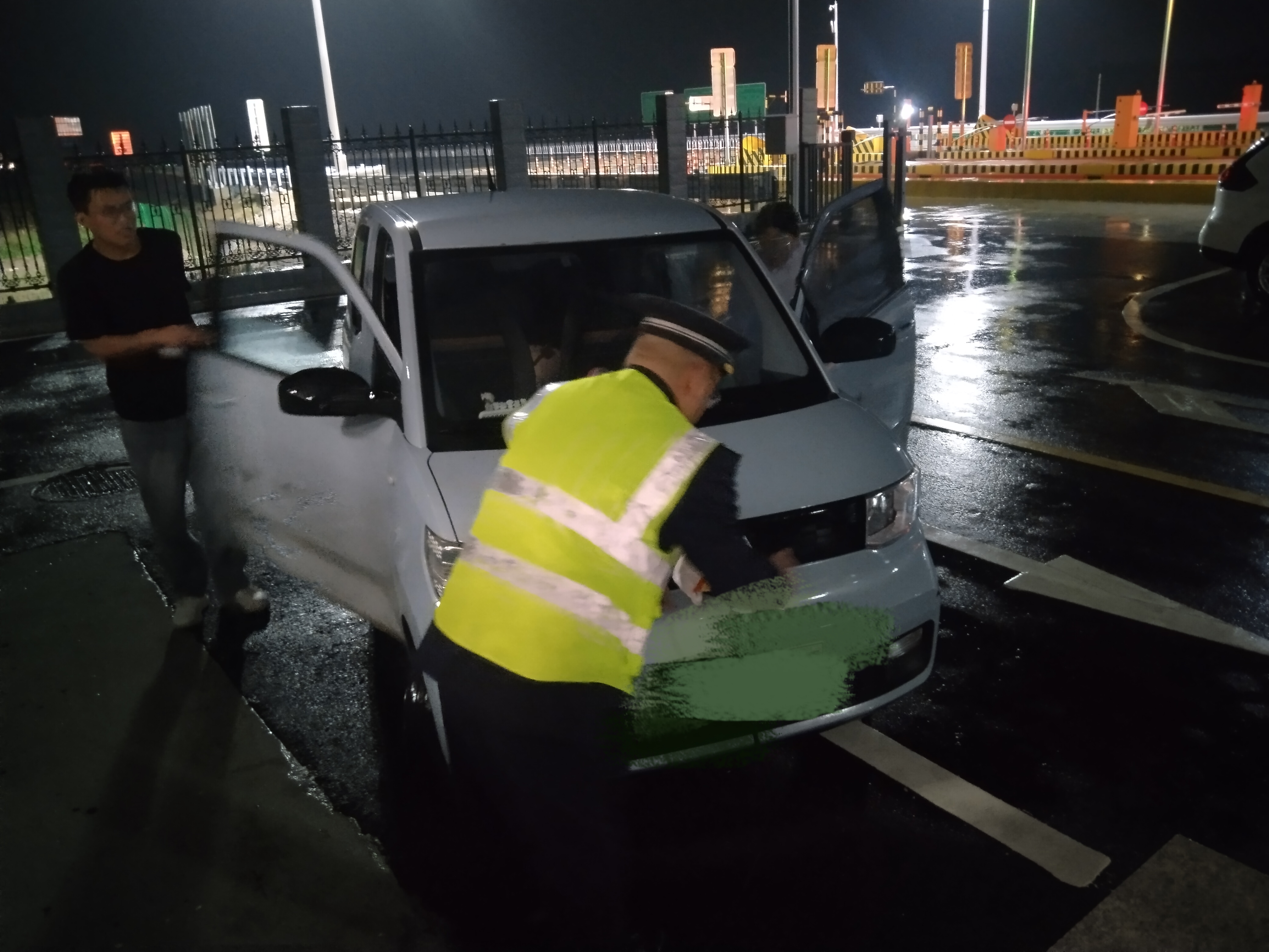 10月15日晚上七点多,一辆新能源车辆快速从高速驶出,车上司机急忙下车向赵欣求助,称车辆亏电,急需充电。赵欣立即将情况上报值班站长孙建伟,得知情况后,二人立即冒雨与司机一同将车从站口推至院区,并迅速拿出充电设备帮助车辆连接充电。等候充电期间,赵欣邀请夫妻二人到门卫室休息,并为他们倒上热水驱寒,夫妻俩感激不已。
