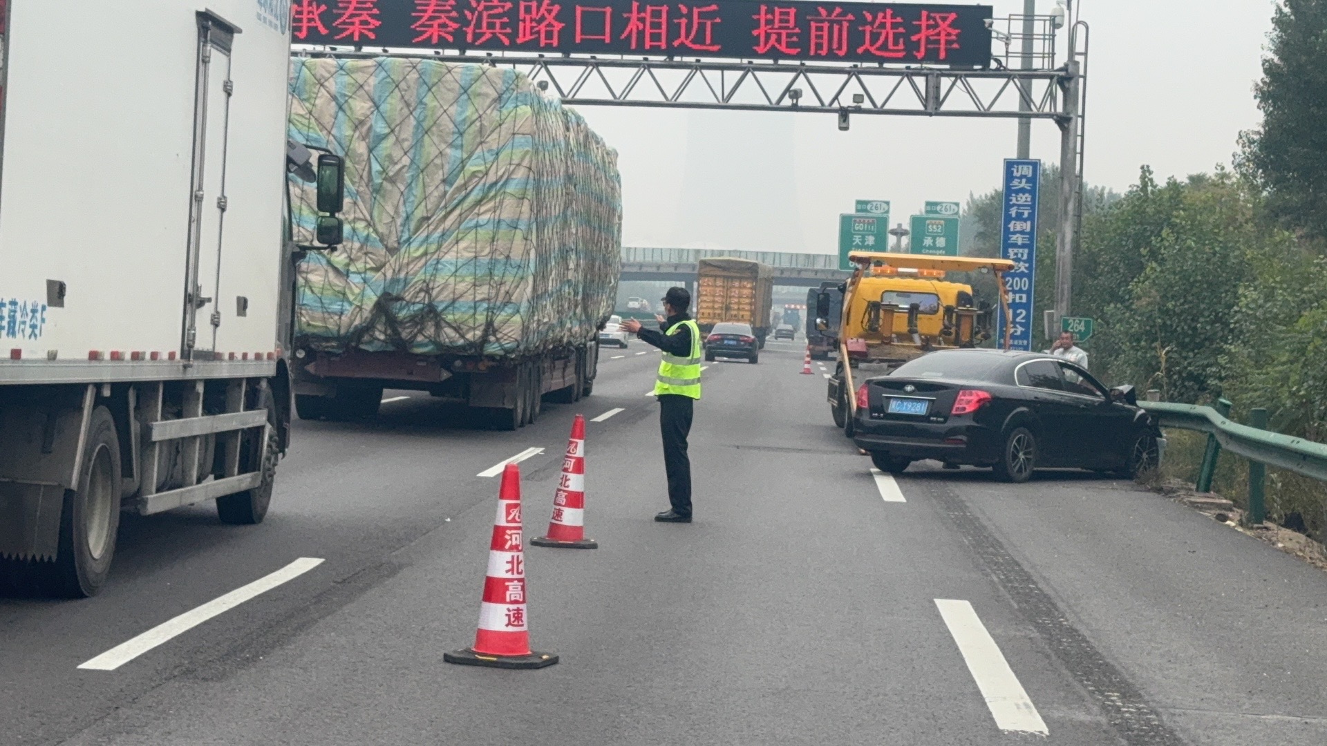 10月15日上午10时许,京秦分公司秦皇岛保通保畅应急大队三中队队员范磊、刘刚,在执行日常巡逻任务途中,于北京方向 K264 路段发现一起突发交通事故。一辆小型轿车与大型半挂车发生刮蹭后,失控撞入道路护栏,现场存在二次事故风险。