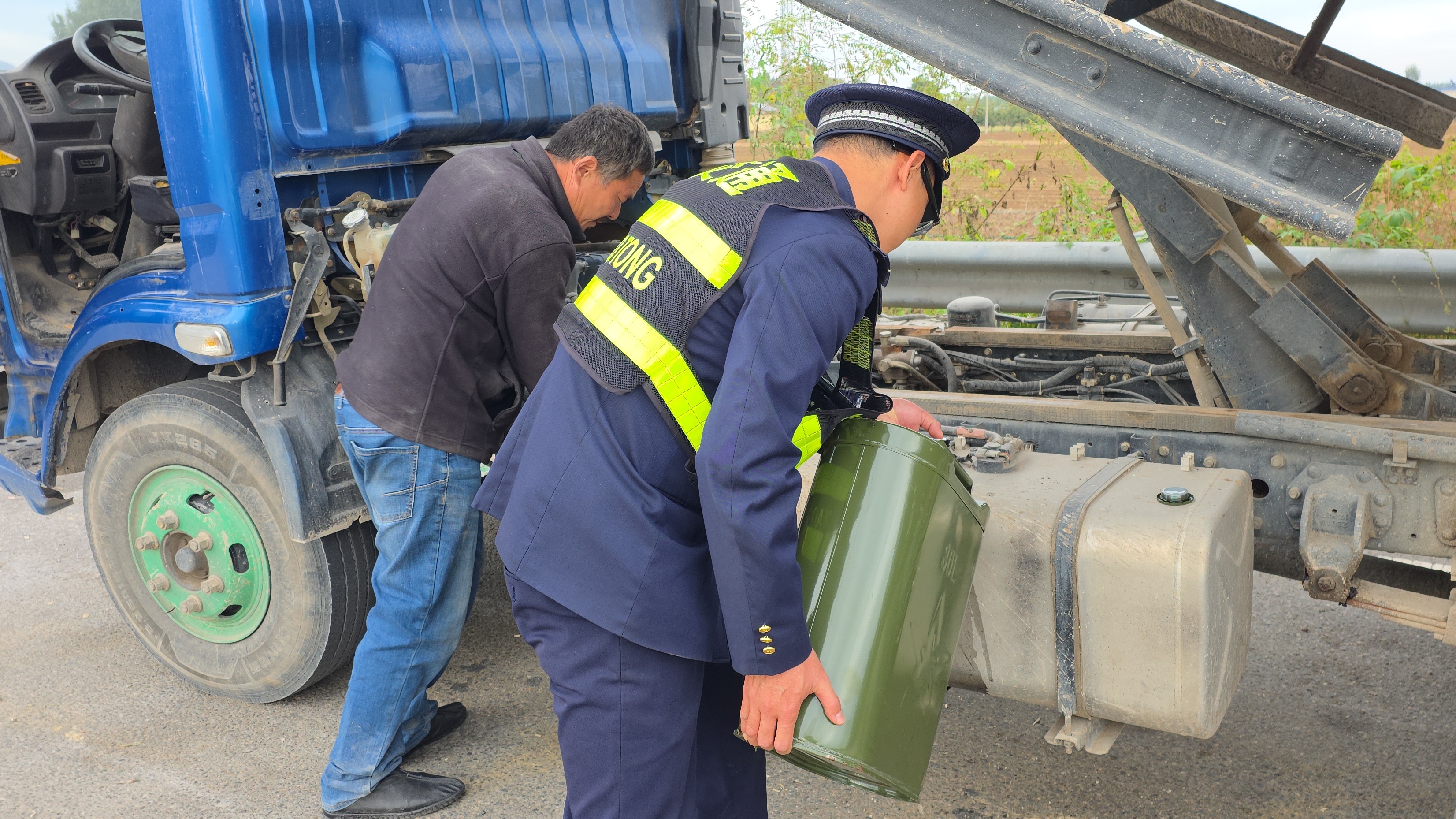 司机焦急地表示:“车子突然动不了,可能没油了,但油表坏了,也没法确定具体原因。”为避免车道拥堵,班长当机立断,帮助司机将车辆推至外广场安全区域。车辆停稳后,司机下车检查,确认故障原因正是燃油耗尽。班长迅速将情况向值班站长汇报,值班站长闻讯立即带领班长取来备用油桶,为货车添加了足量应急燃油,确保车辆能够正常行驶至附近加油站。同时,值班站长还详细告知了司机周边加油站的具体位置和行驶路线,贴心解决了司机的后续顾虑。