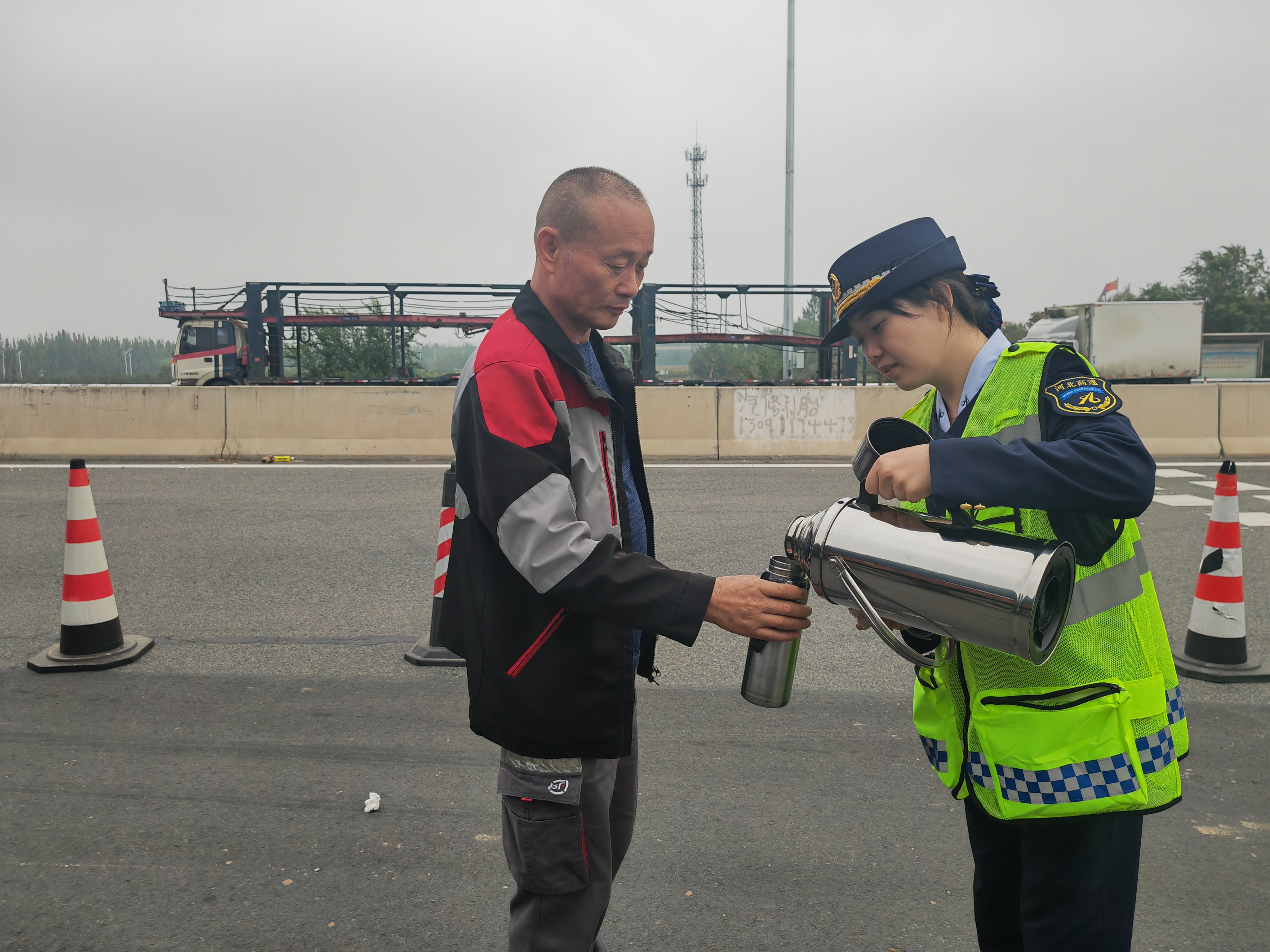 为缓解司乘人员等待时的焦虑情绪,工作人员拎着保温水壶,逐车上前,热情为滞留收费站的司乘免费提供热水。一杯杯冒着热气的开水,不仅驱散了雾天的寒意,更传递着收费站细致入微的人文关怀。服务过程中,工作人员还主动询问滞留人员是否需要其他帮助,耐心解答路线咨询、限行信息等疑问,尽力解决实际困难,让焦急的司乘在等待中倍感温暖与安心。