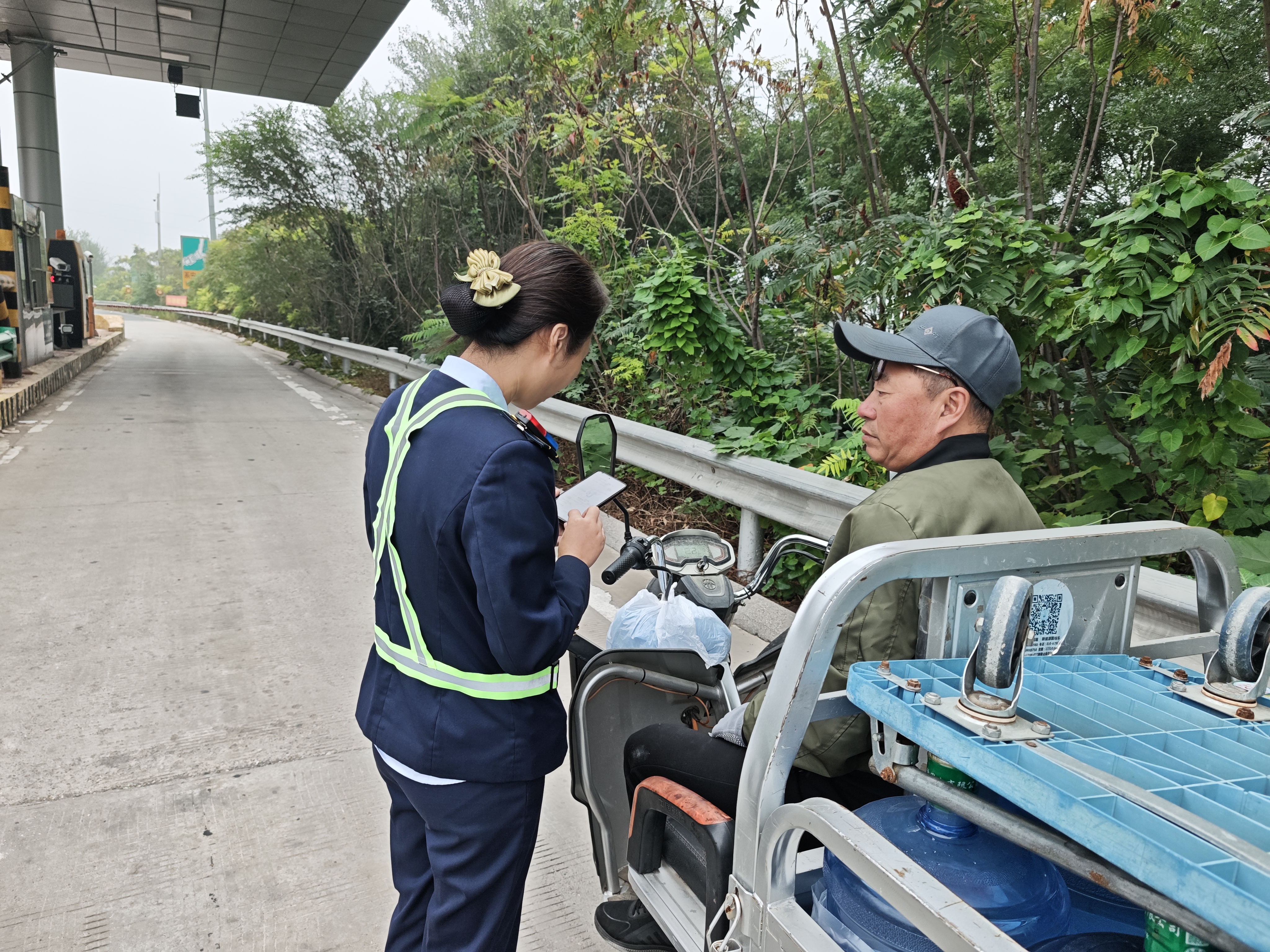 10月22日10点左右,固安南收费站发卡员工作时发现外广场一辆电动三轮车从入口车道缓缓驶入,发卡员立即通知班长迅速前去拦截。班长询问得知老人要去周边的企业和村庄送桶装水,导航设置错误导致误入高速,班长随即一边劝说老人一边示意老人退出车道,老人拒绝说走国道路远,所以执意要走高速,希望工作人员通融一下。班长耐心细致向老人讲解了相关法律规定,并从其自身安全出发,告知驾驶非机动车在高速公路上行驶的危险性。最终,班长耐心讲解和劝说,并帮助老人重新导航设置了电动车行驶方式,避免再次驶入高速,老人表示理解,并感谢收费站工作人员工作的细心和耐心,随后连声道谢后掉头驶离收费站。
