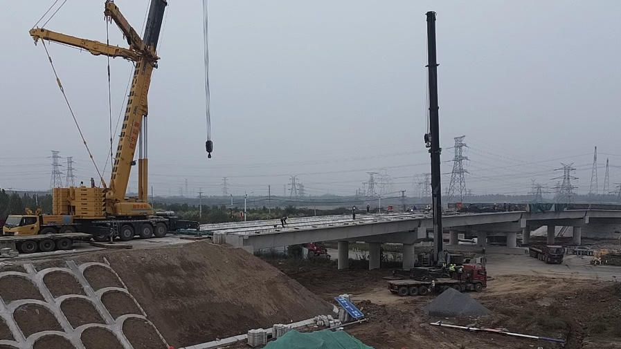 此次实现贯通的肥乡西互通A匝道1号跨线桥,全长148米,结构为单联预应力混凝土小箱梁,桥墩采用柱式墩结构。该桥需上跨交通繁忙的国道G309,施工方采用“双机跨外”的吊装工艺,在确保下方国道通行不受影响的同时,高效完成了全部箱梁的架设任务。