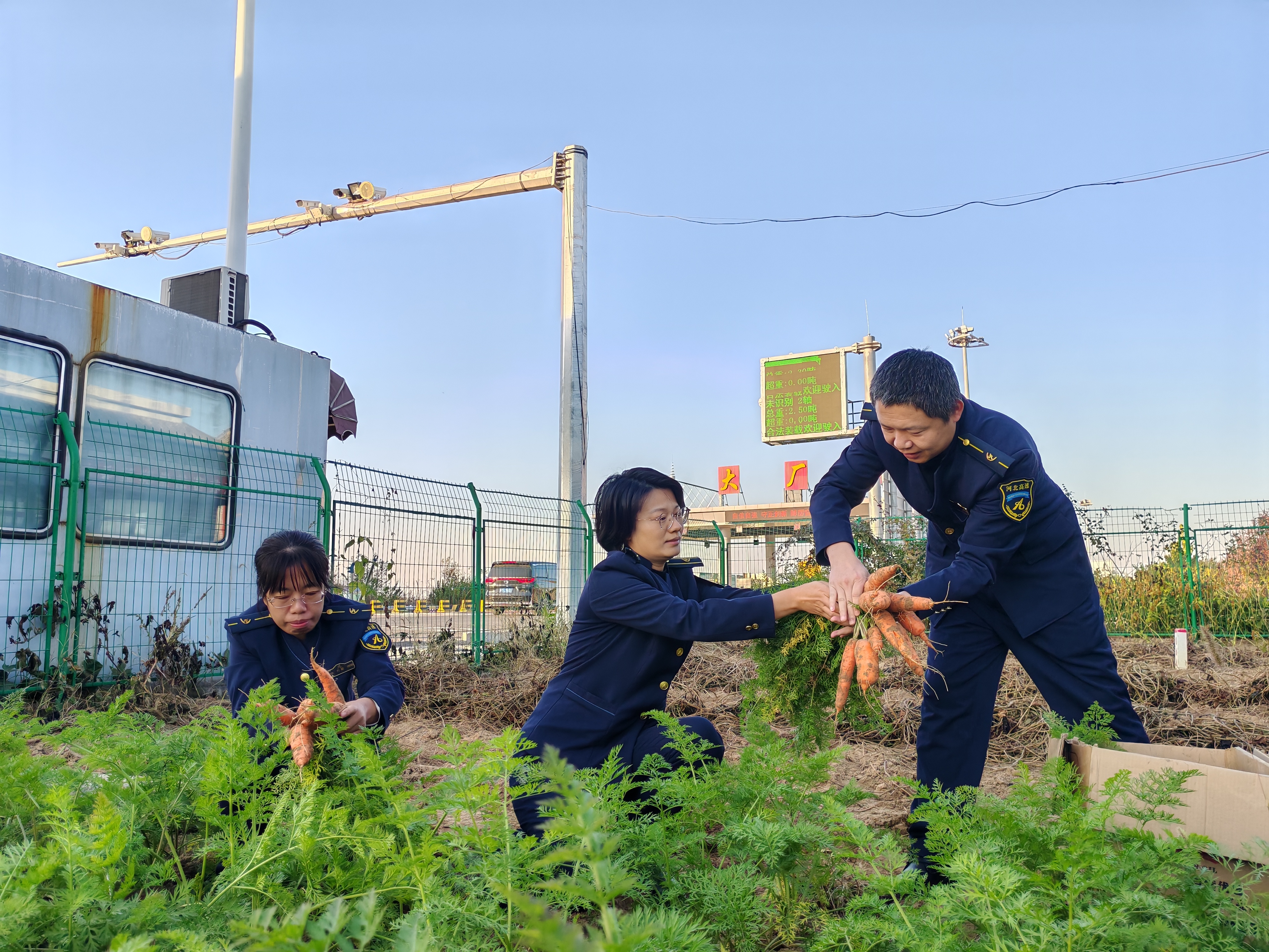 近日,大厂东收费站的职工小菜园里迎来了一片热闹的丰收景象,充满了欢声笑语。在岗人员拿着工具共同收获他们亲手种植养成的胡萝卜。