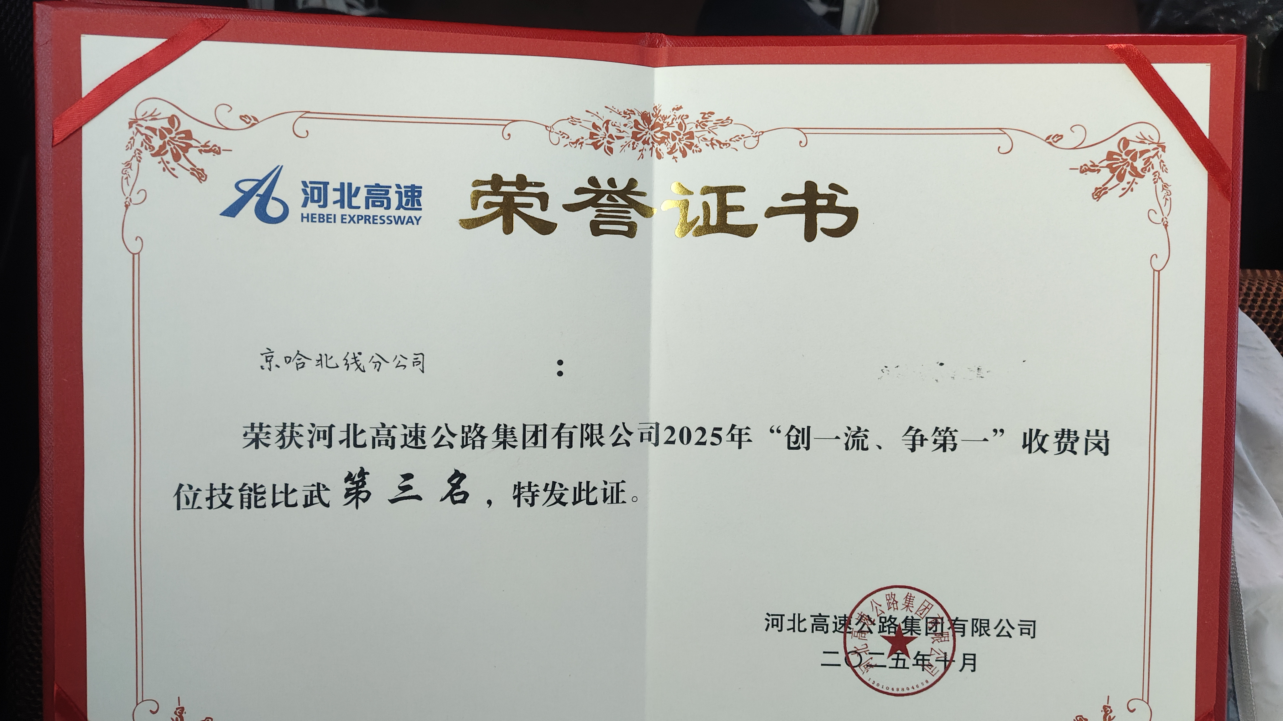 10月29日,集团公司2025年“创一流 、争第一”收费岗位技能比武总决赛圆满落幕,京哈北线分公司荣获集团公司2025年“创一流、争第一”收费岗位技能比武总成绩第三名,参赛选手高倩凭借扎实的知识储备、敏捷的应变能力,荣获总决赛个人成绩第三名的优异成绩,充分展现了我单位职工精湛的业务技能和昂扬的精神风貌,为京哈北线分公司赢得了荣誉。