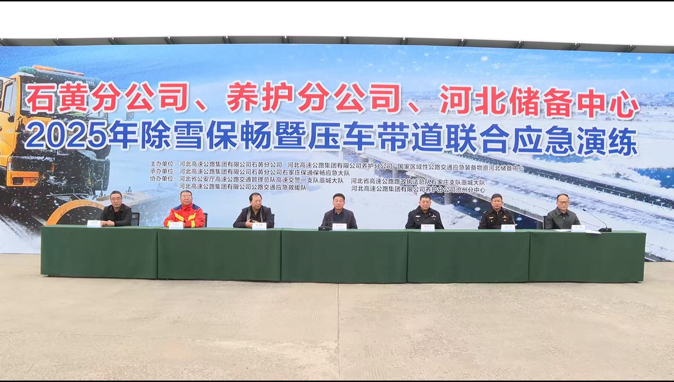 为更好检验“一路多方、协调联动”冬季除雪保畅工作机制,完成今冬明春除雪保畅工作。2025年11月5日上午,养护分公司联合石黄分公司,于藁城养护队驻地,举办“2025年除雪保畅暨压车带道联合应急演练”,河北高速集团有限公司石黄分公司党委书记翟忠伟,国家区域性公路交通应急装备物资河北储备中心主任梁文斌,河北高速公路集团有限公司公路交通应急救援队队长朱宏文,养护分公司副总经理左志国,石黄分公司副总经理孙越,河北省公安厅高速公路交通管理总队高速交警一支队藁城大队队长赵双虎,河北省高速公路路政执法总队石家庄支队藁城大队队长赵宏伟,出席此次演练。