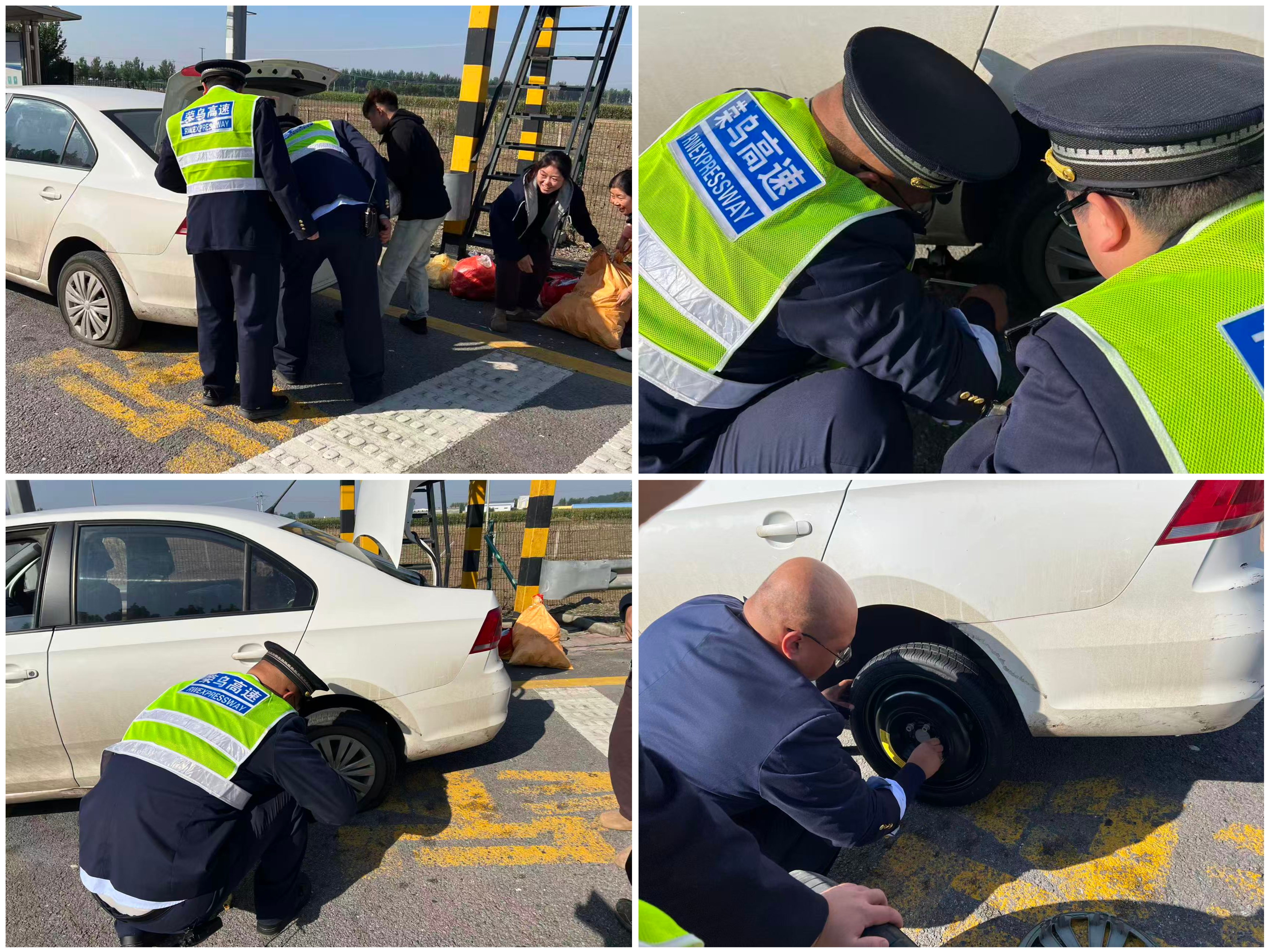 收费班长闻讯立即赶赴现场,一方面耐心安抚司乘人员的情绪,缓解其内心的焦虑与不安;另一方面主动表示愿意提供换胎协助。随后,收费班长和疏导员凭借着精湛的专业技能,有条不紊地展开了一系列操作:松卸螺丝、架设千斤顶、拆卸爆胎、安装备胎、紧固螺丝……整个过程行云流水,仅耗时十分钟,便使车辆重新具备了安全行驶的条件。