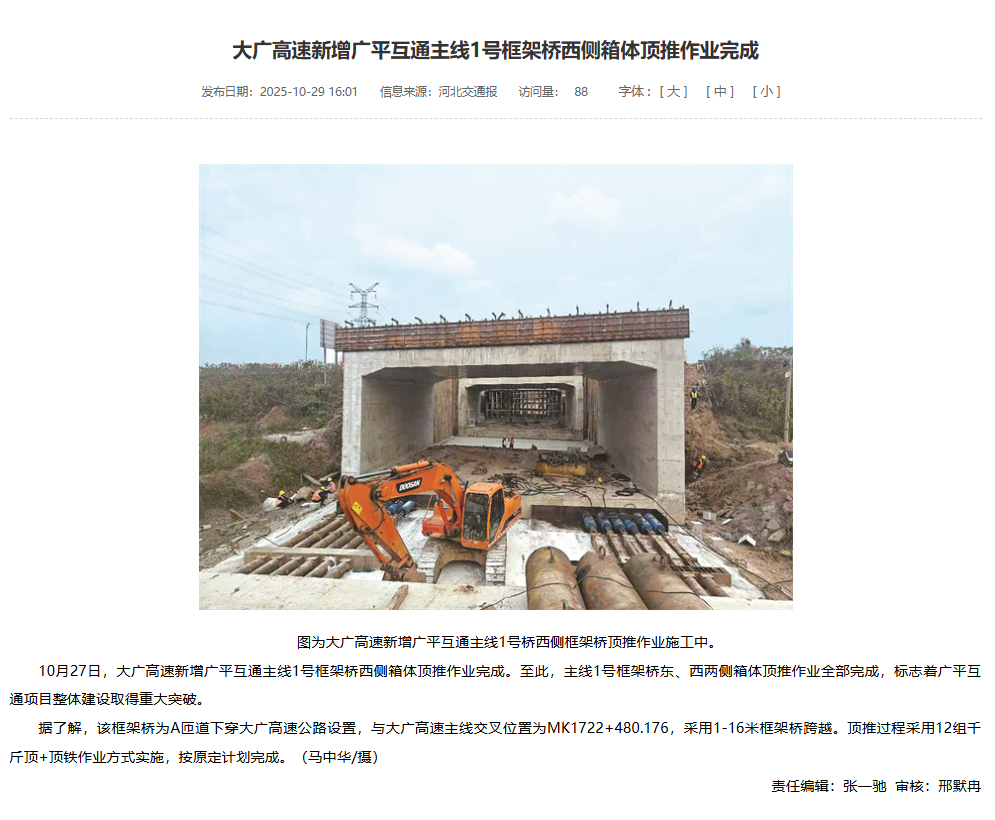 河北交通报:大广高速新增广平互通主线1号框架桥西侧箱体顶推作业完成