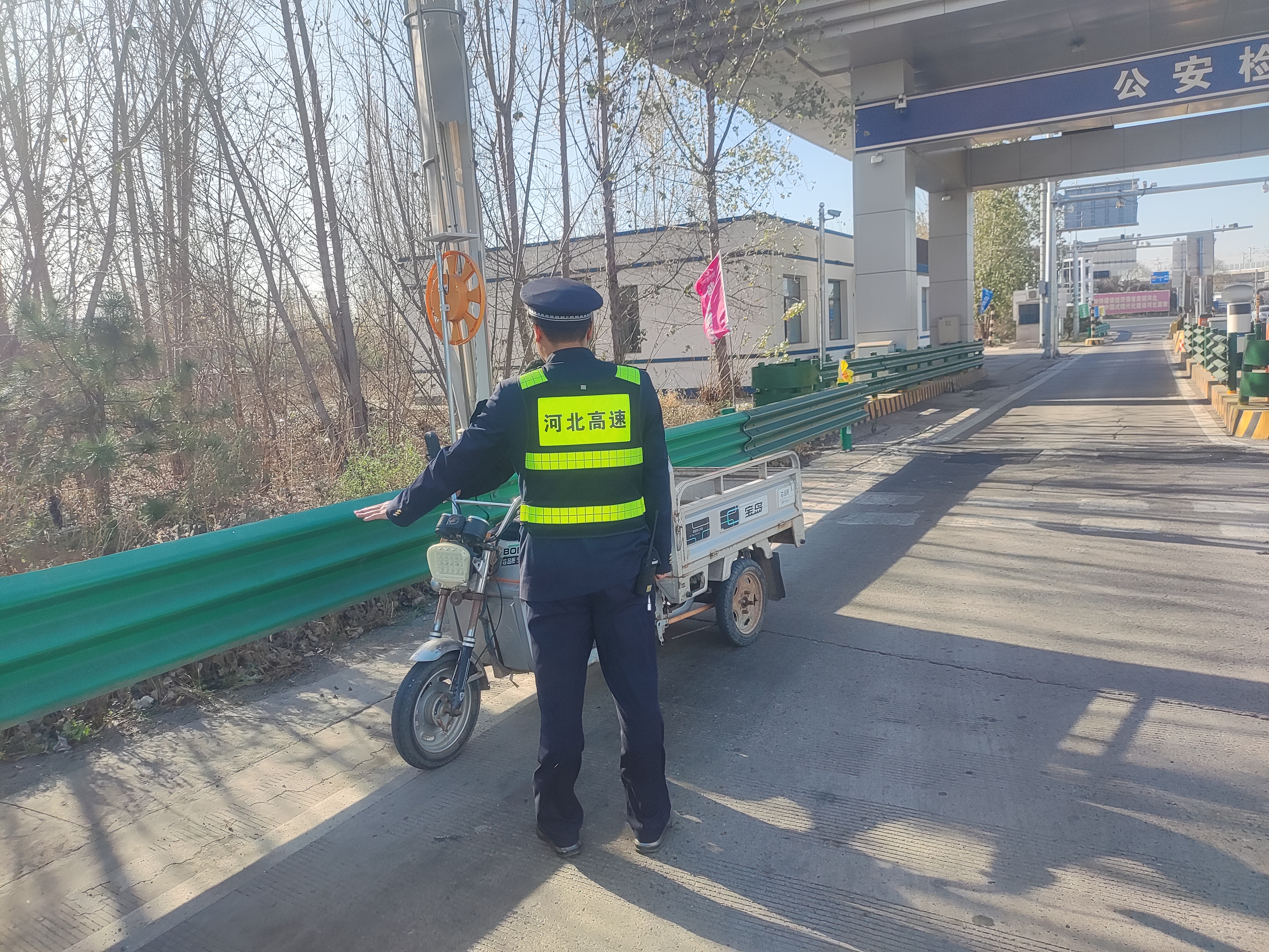 11月16日上午11时许,固安东收费站车流量平稳有序,外广场却出现了特殊情况,一位骑着电动三轮车的老人缓缓驶来,打算骑行上高速。