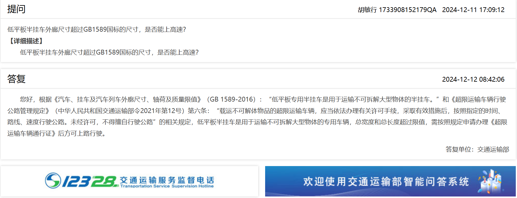 您好,根据《汽车、挂车及汽车列车外廓尺寸、轴荷及质量限值》(GB 1589-2016):“低平板专用半挂车是用于运输不可拆解大型物体的半挂车。”和《超限运输车辆行驶公路管理规定》(中华人民共和国交通运输部令2021年第12号)第六条:“载运不可解体物品的超限运输车辆,应当依法办理有关许可手续,采取有效措施后,按照指定的时间、路线、速度行驶公路。未经许可,不得擅自行驶公路”的相关规定,低平板半挂车是用于运输不可拆解大型物体的专用车辆,总宽度和总长度超过限值,需按照规定申请办理《超限运输车辆通行证》后方可上路行驶。https://qa.mot.gov.cn/mapplys/pub/visitor/userIndex/questionDetail?id=70f1b20d-e976-4d4b-83d4-d83c2ab03c2e50