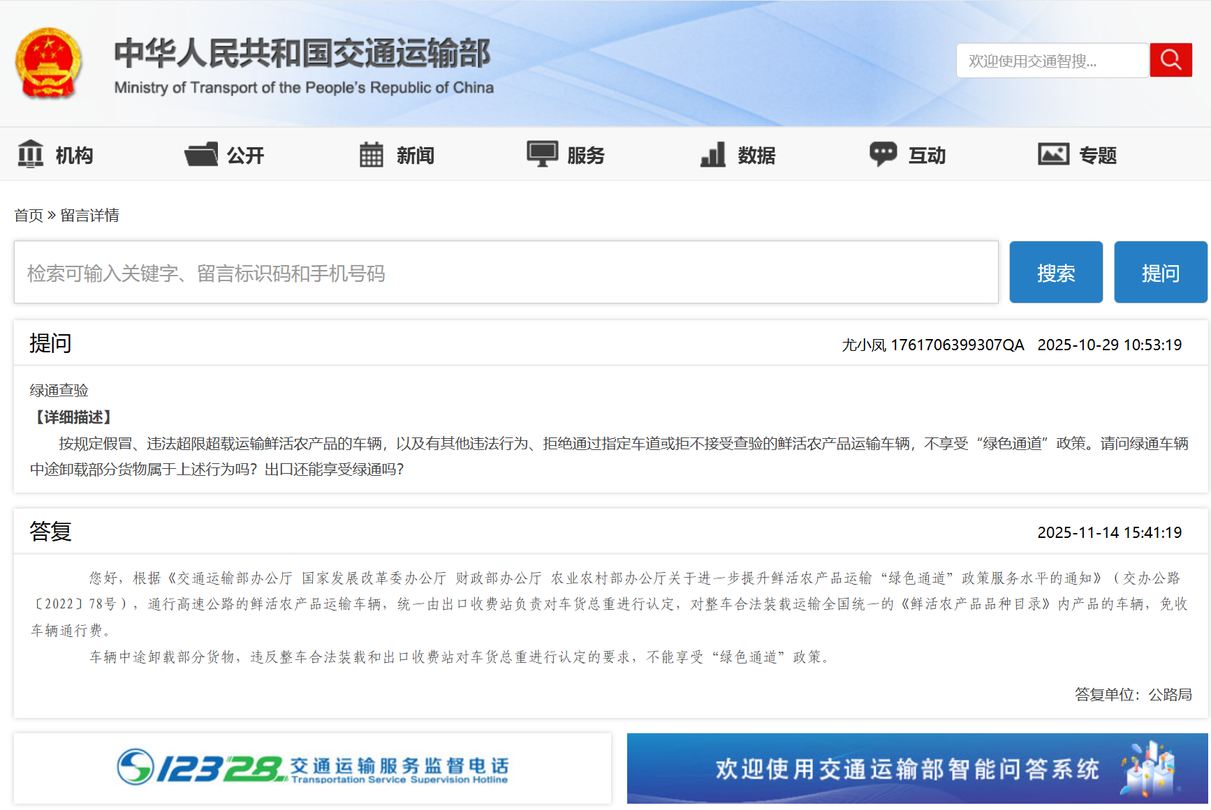 答:您好,根据《交通运输部办公厅 国家发展改革委办公厅 财政部办公厅 农业农村部办公厅关于进一步提升鲜活农产品运输“绿色通道”政策服务水平的通知》(交办公路〔2022〕78号),通行高速公路的鲜活农产品运输车辆,统一由出口收费站负责对车货总重进行认定,对整车合法装载运输全国统一的《鲜活农产品品种目录》内产品的车辆,免收车辆通行费。