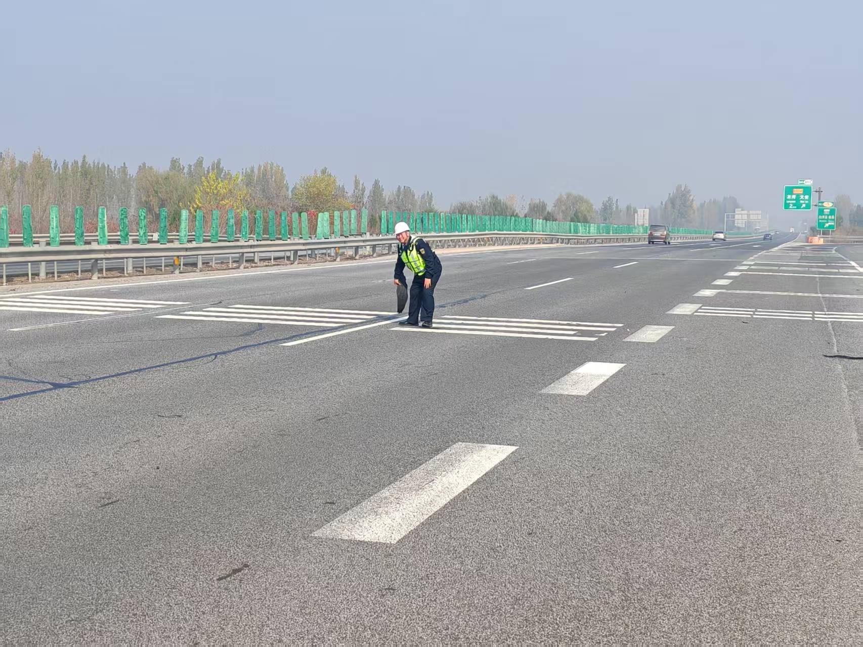2025 年 11 月 17 日上午,牛驼大队按照日常巡查工作计划,对辖区内主要交通干线开展路面安全排查工作。当巡查队伍行至北京方向1380公里处时,队员发现路面散落着多块废弃轮胎皮,对过往车辆行驶安全构成严重威胁。