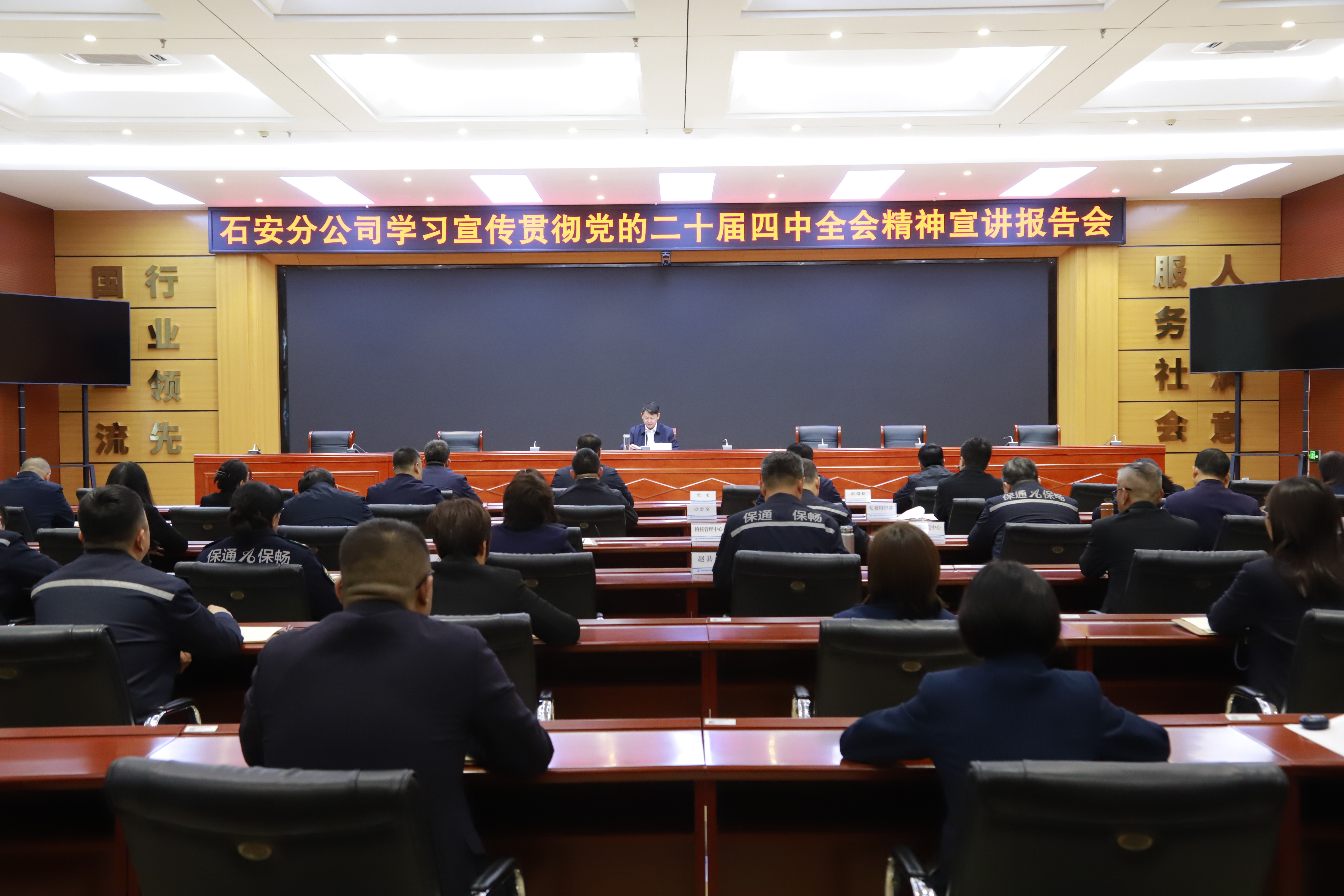 11月26日,石安分公司党委召开学习宣传贯彻党的二十届四中全会精神宣讲报告会。分公司党委书记陈园明作宣讲报告,领导班子成员、纪委副书记,各单位、各部室负责人、总部全体党员及职工代表共300余人在主、分会场参加。