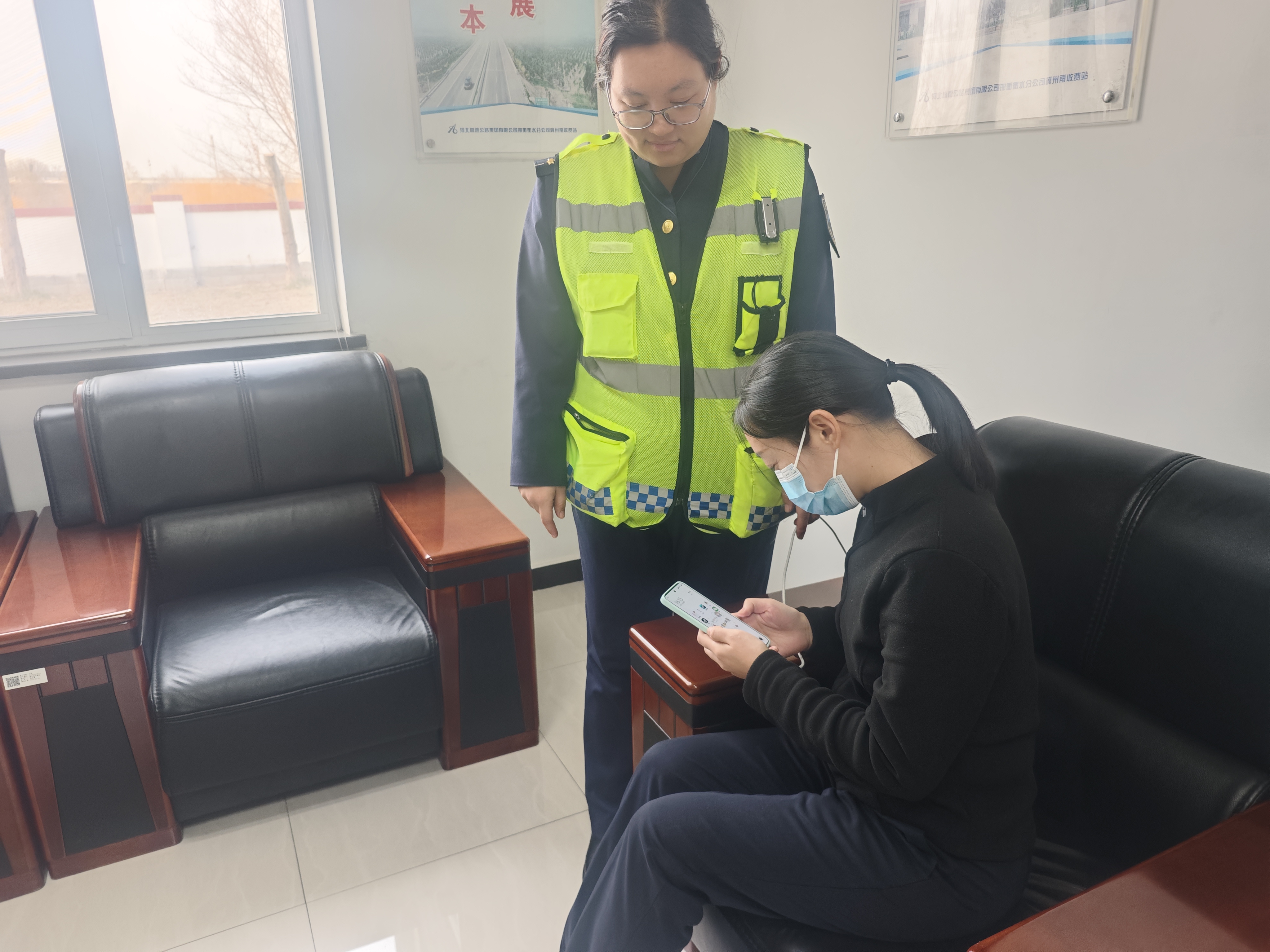 当班收费员见状,立即通过对讲机上报班长。班长迅速赶到现场,一边安抚王女士:“您别急,我们便民服务箱里有适配充电器,先帮您充电”,一边引导车辆停靠至外广场安全区域,以免影响通行秩序。随后,班长从便民服务点取来充电器,为王女士的手机接通电源。看到屏幕亮起充电提示,王女士紧锁的眉头渐渐舒展开来。