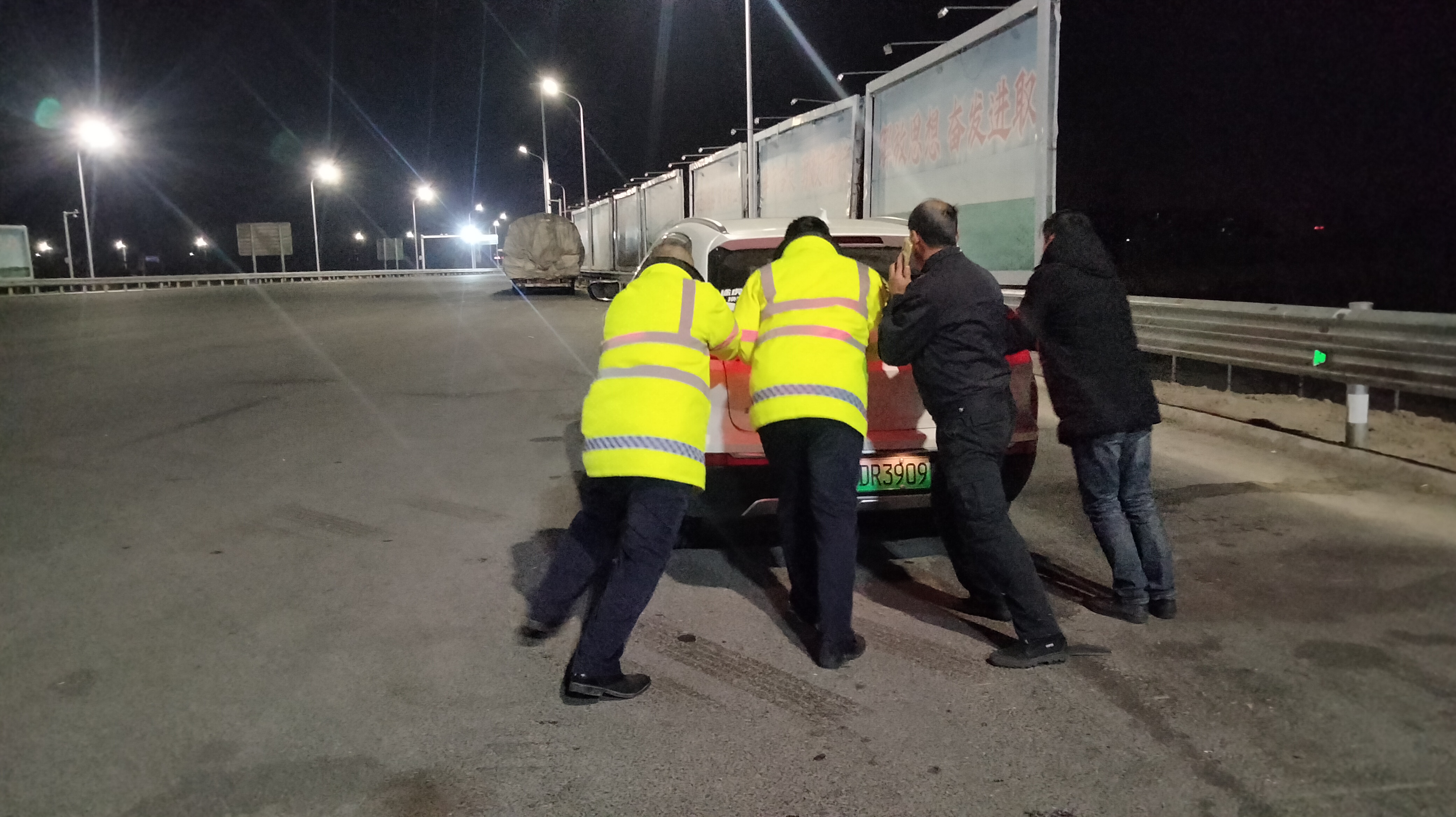 12月1日20时20分左右,宁晋东收费站收费广场上一辆白色电动汽车刚驶出收费车道便停滞不前,后方车辆纷纷鸣笛。当班班长王刚发现异常后,立即上前询问情况,并向值班站长朱立龙汇报。