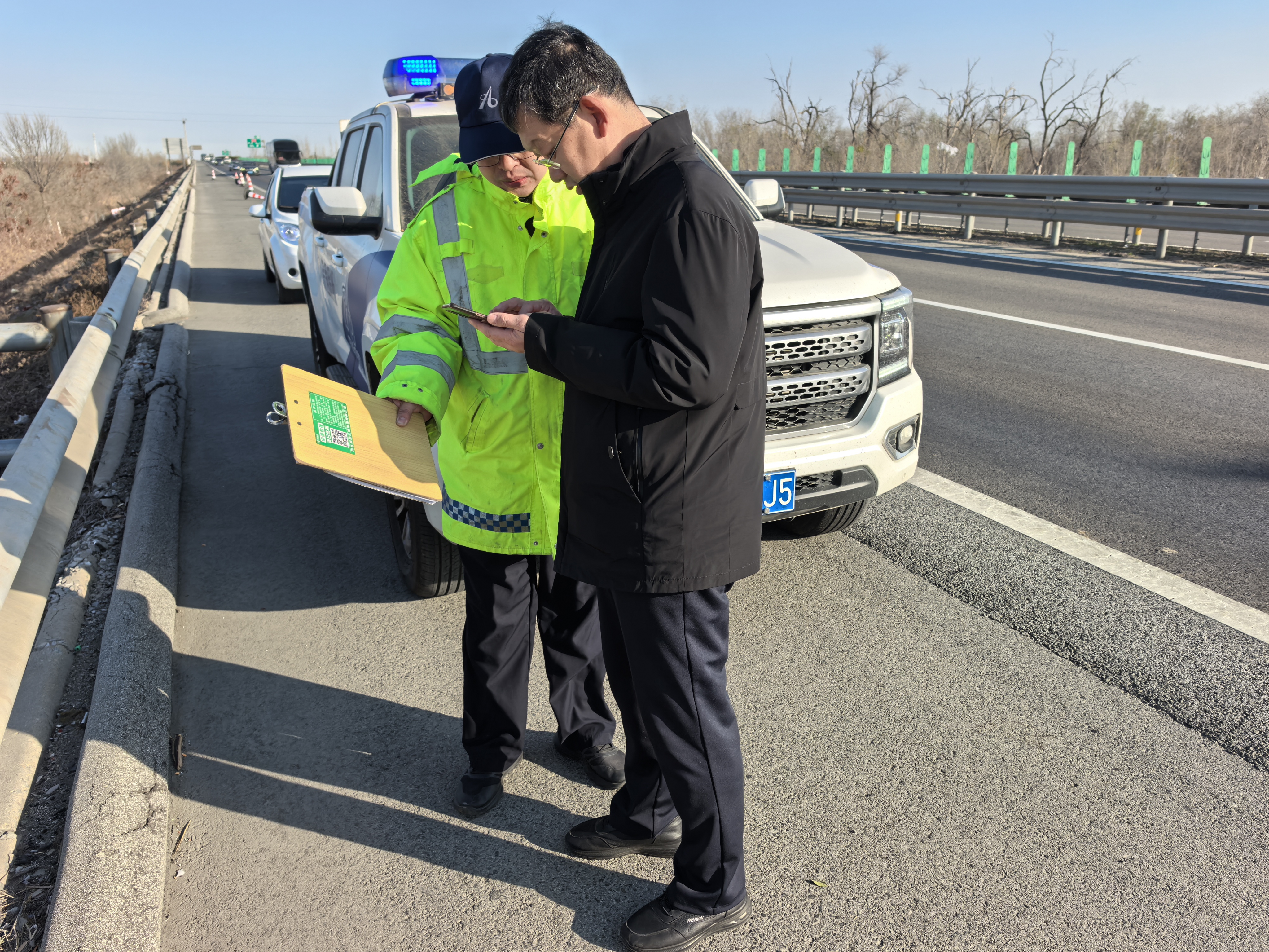 保畅队员赵吉升迅速在故障车后方设置安全警戒区,俯身查看车辆故障部位,另一位队员代乐拨通救援公司电话,同步报出精准定位与车辆信息,拖车派单指令当场确认。得知驾驶员对高速救援流程陌生,他掏出一张“一键救援码”递过去:“您扫这个码,直接跳转救援界面,系统会自动同步您的精准位置!救援力量最快5分钟联动到位!”