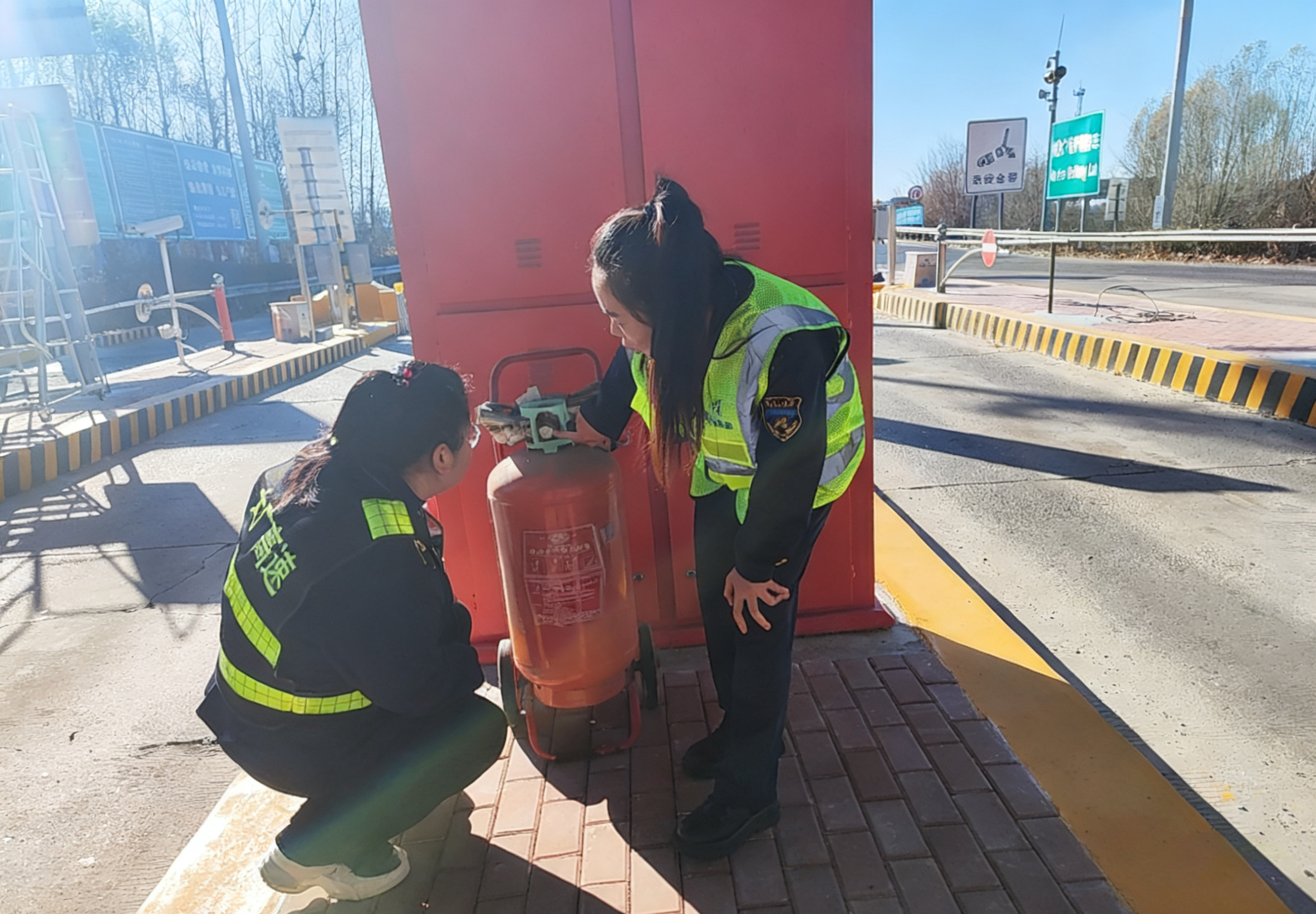 寒风凛冽的清晨,固安温泉园收费站的安全分管负责人与安全员已开启新一天的 “安全守护模式”。12 月 2 日上午,该站岗亭旁,两名身着反光背心的工作人员正蹲身细致检查消防器材 —— 逐一核对压力表是否正常、瓶身有无锈蚀、安全卡扣是否完好,每一项都一丝不苟。