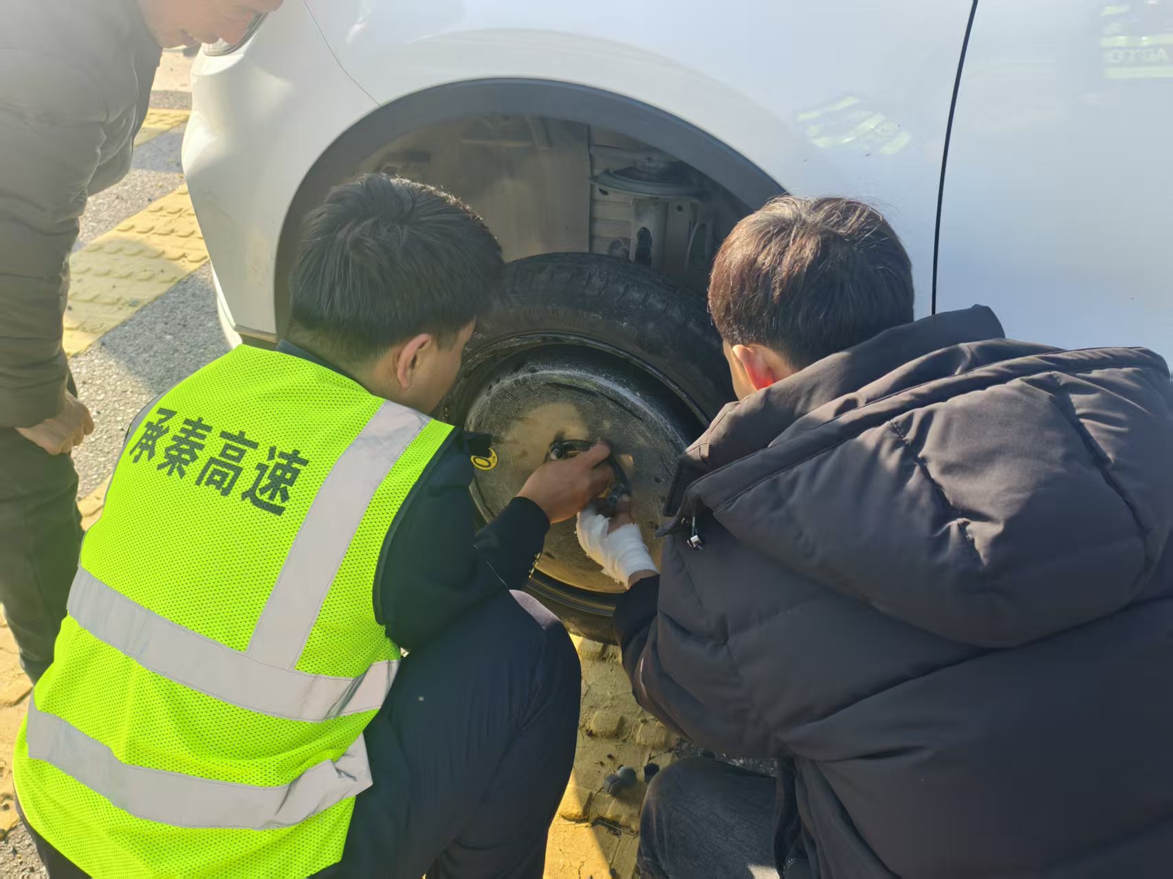 了解情况后,工作人员迅速分工,引导车辆到安全地带,做好疏导和安全防护措施后,当班班长取来工具帮忙更换备胎。经过十多分钟紧张忙碌,备胎顺利更换完毕,车辆恢复正常行驶条件。司机激动致谢:“多亏了你们,要不我们都不知道什么怎么办了,太谢谢你们了!”