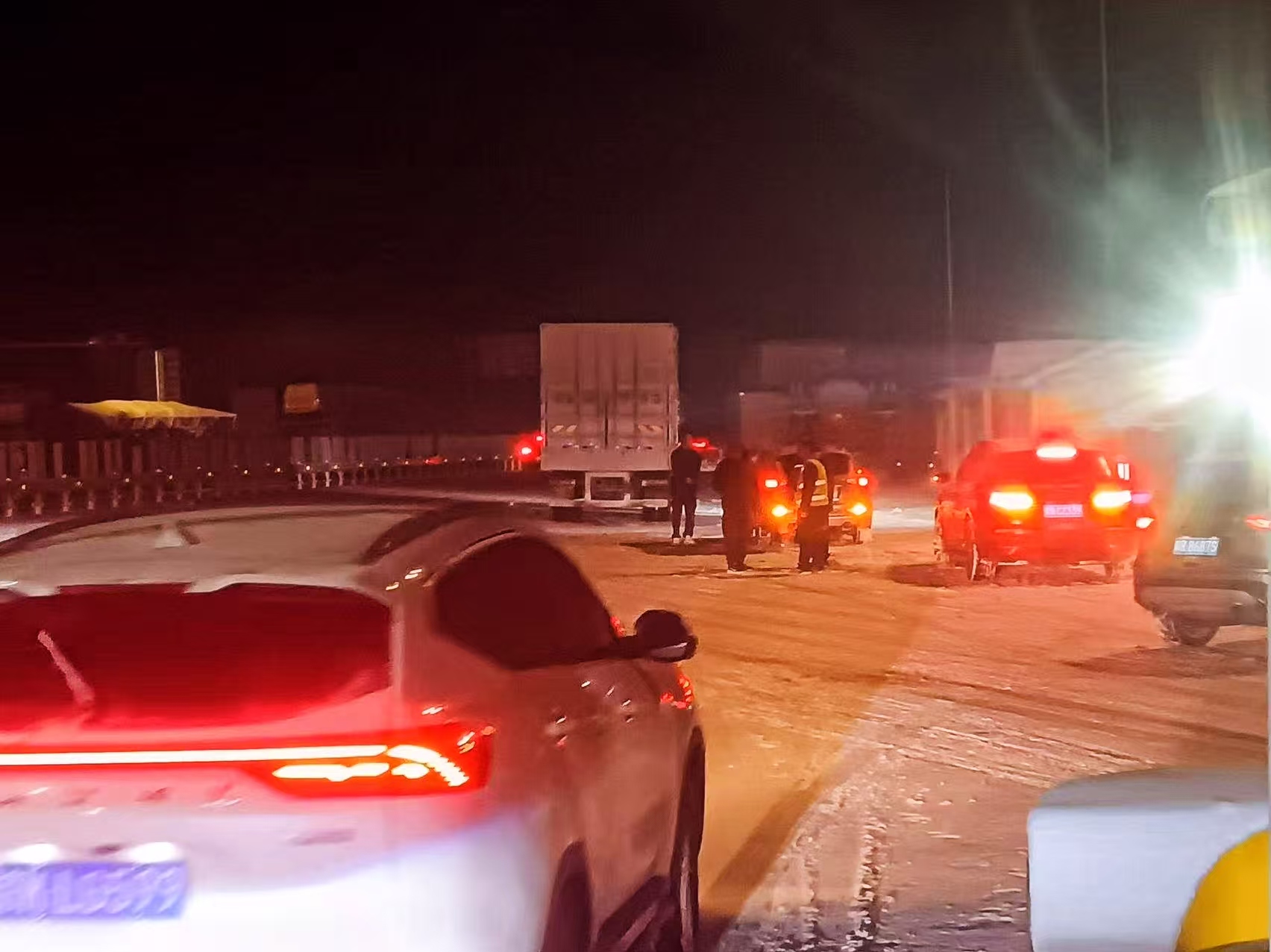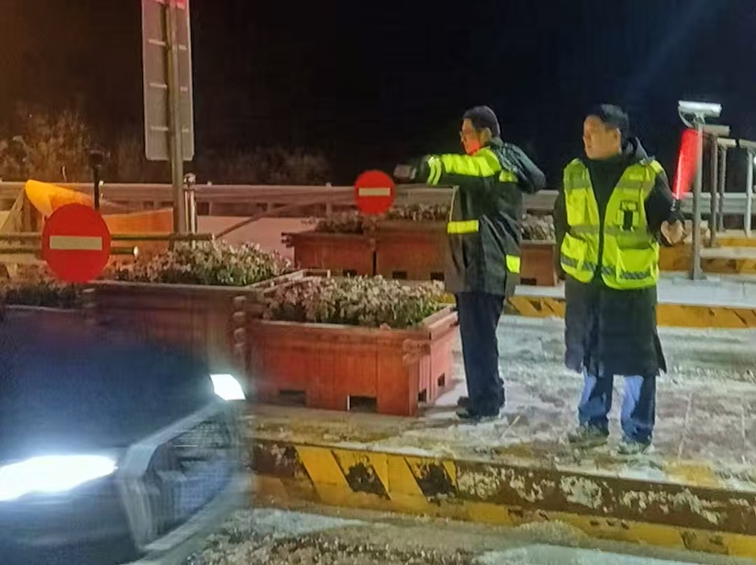 夜幕降临后,路面结冰湿滑隐患加剧,车流量持续攀升,分流压力陡然增大。面对紧急情况,怀来北收费站一线当班人员与后勤人员迅速全员集结,义无反顾投入抗雪保畅战斗。他们顶风冒雪坚守岗位,一边精准指引车辆有序通行,一边及时清理收费车道积雪,全力保障道路通行条件;同时耐心向司乘人员解释分流原因、详细告知绕行路线,用心安抚群众焦急情绪,用实际行动化解出行难题。