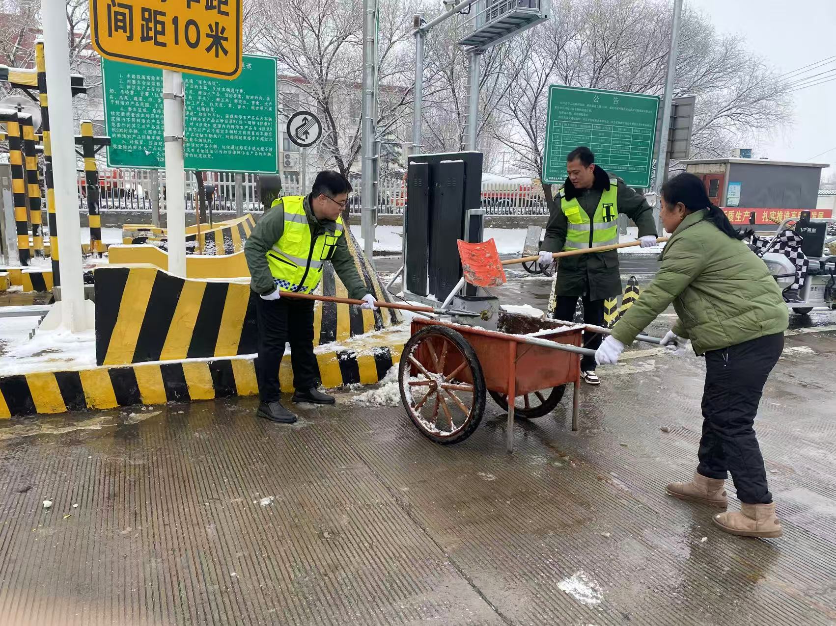 黄色的安全警示栏旁,身着荧光绿反光背心的工作人员身影格外醒目,他们的动作娴熟而有力,额头渐渐渗出的汗珠,在冬日的寒气里凝成了淡淡的白雾。女同事也主动加入除雪队伍,推着小车与男同事并肩作战,没有一人喊苦喊累。大家心里只有一个念头:尽快清理完积雪,保障收费站车道畅通,让过往车辆能安全、顺利通行。