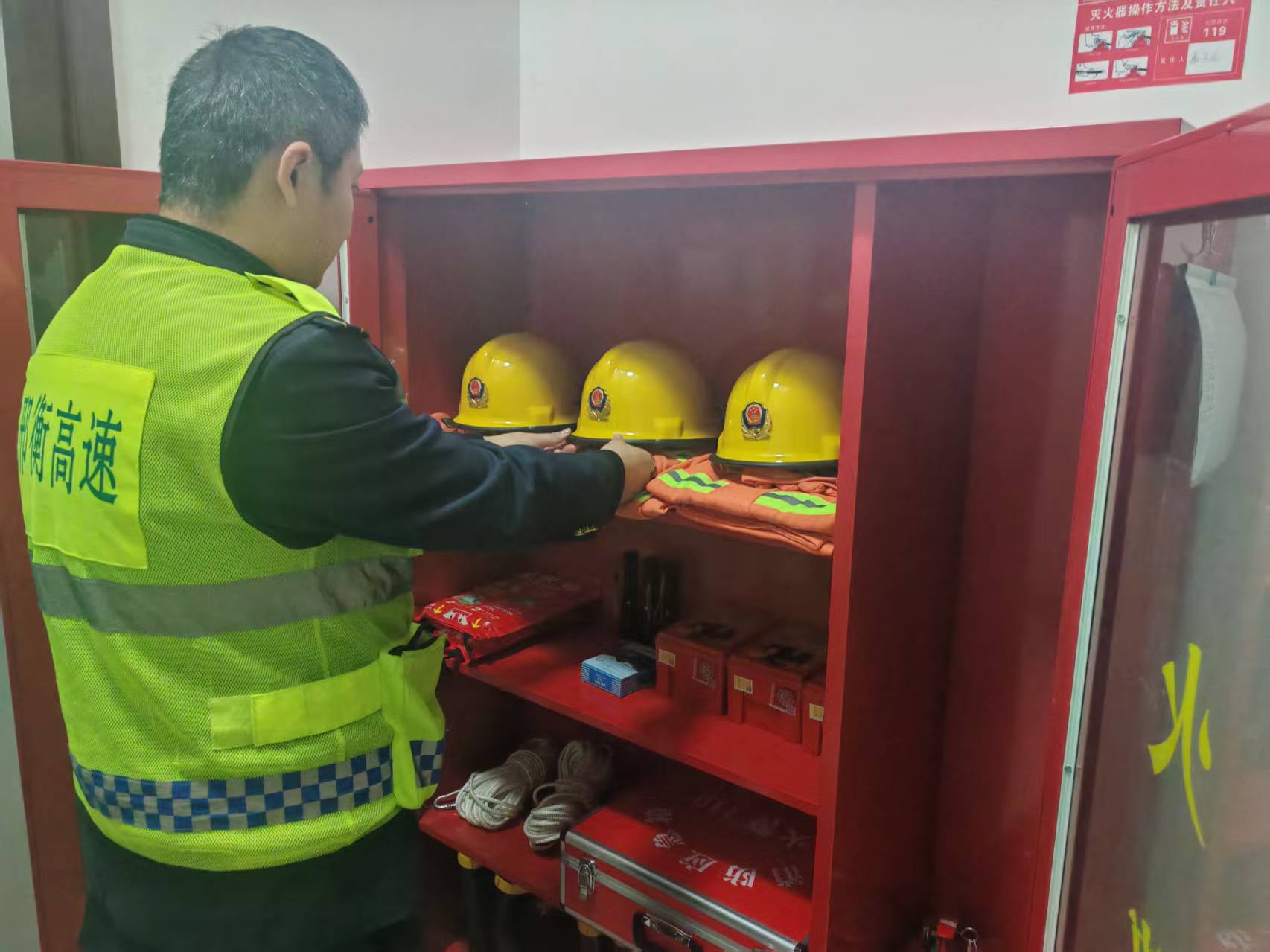三是紧盯消防保障,实地查验灭火器、消防柜等消防设施配置及完好情况,确保应急处置能力到位,有效应对各类突发状况。