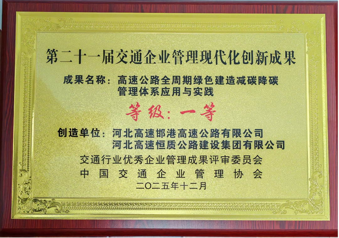 近日,经中国交通企业管理协会成果评审委员会审定,邯港公司申报的“高速公路全周期绿色建造减碳降碳管理体系应用与实践”成果荣获“第二十一届交通企业管理现代化创新成果一等奖”;“BOT+ESG融合创新模式在高速公路建设中的实践”与“基于光纤感知技术在高速公路运行管理的应用”荣获二等奖。公司主要创作者及邯港高速绿色建造应用创新团队分别获评“创新管理实践者”与“创新团队”荣誉称号。系列荣誉是对邯港公司在高速公路建设管理创新、技术实践与人才建设等方面突出成效的充分肯定。