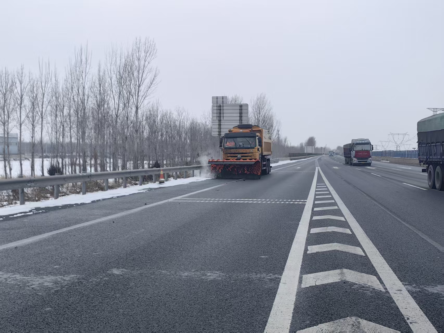 针对不同路段的地形特点与积雪情况,除雪作业队伍全面落实“两个清单”,采取“固态撒布+局部铲雪”的精准作业模式:在主行车道、长直路段等开阔区域,作业车辆高效开展固态融雪剂撒布作业,快速降低路面结冰风险;在桥梁、互通立交、急弯陡坡等易积雪结冰重点区域,以及车流量较大的路段局部区域,同步投入铲雪设备开展集中铲雪作业,彻底清除路面积雪,保障车辆通行顺畅。作业人员顶风冒雪、轮班值守,始终坚守在除雪一线,用实干诠释责任担当。