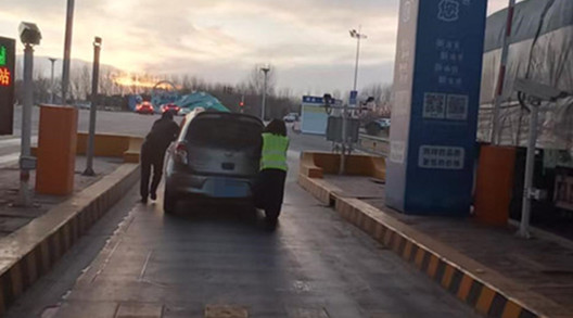 1月22日17时许,寒潮来袭,天气严寒,香河收费站出口车道内,一位老人独自驾驶的车辆突发故障停滞不前,恰逢下班高峰,现场车流量较大,情况十分紧急。正在外巡岗执勤的收费员发现该情况后,立即上前查看询问。