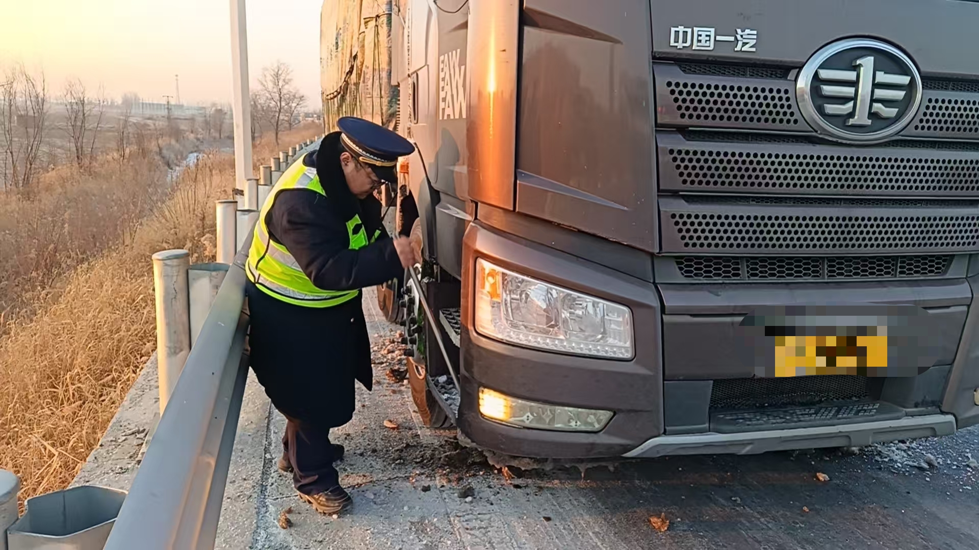 经询问得知,该车运输的是水果,车辆从南往北行驶途中,受气温骤降影响,多个车轮内侧结满厚冰,这才引发异响。了解原因后,赵洪源迅速引导司机将车停至安全区域,主动协助司机铲除车厢及车轮上的积冰。安全隐患排除后,货车行驶不再有异响,既化解了行车风险,也避免了因车厢结冰导致称重不准,保障了绿通车辆高效通行。