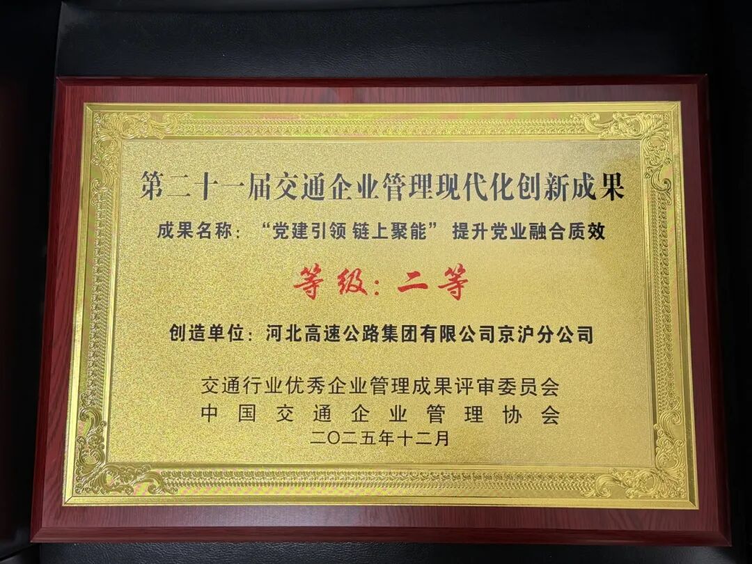 近日,经中国交通企业管理协会成果评审委员会严格审定,京沪分公司申报的“党建引领 链上聚能 提升党业融合质效”成果,荣获第二十一届交通企业管理现代化创新成果二等奖。此次获奖,是对京沪分公司始终坚持以高质量党建引领高质量发展,在管理模式与运营服务上锐意创新所获成效的充分肯定。