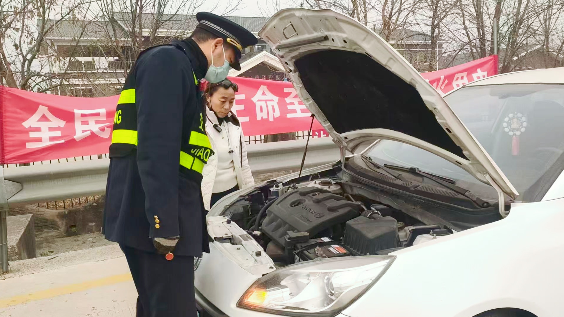 “刚才车子突然熄火,我试着重启了好几次都没反应,我一个女司机,对车子一窍不通,真的不知道该怎么办了。”班长见状,先是轻声安抚司机情绪:“您别着急,先到旁边避风的地方等会儿,我帮您看看是什么问题,应该不是大毛病。”说完,他熟练地打开轿车引擎盖,俯身仔细排查起来。发动机舱里线路繁杂,他却丝毫没有慌乱,目光专注地逐一检查线路接口、查看电瓶电量,凭借多年在收费站帮司乘处理车辆小故障的经验,短短几分钟,班长就找到了症结:“是电瓶亏电了。”