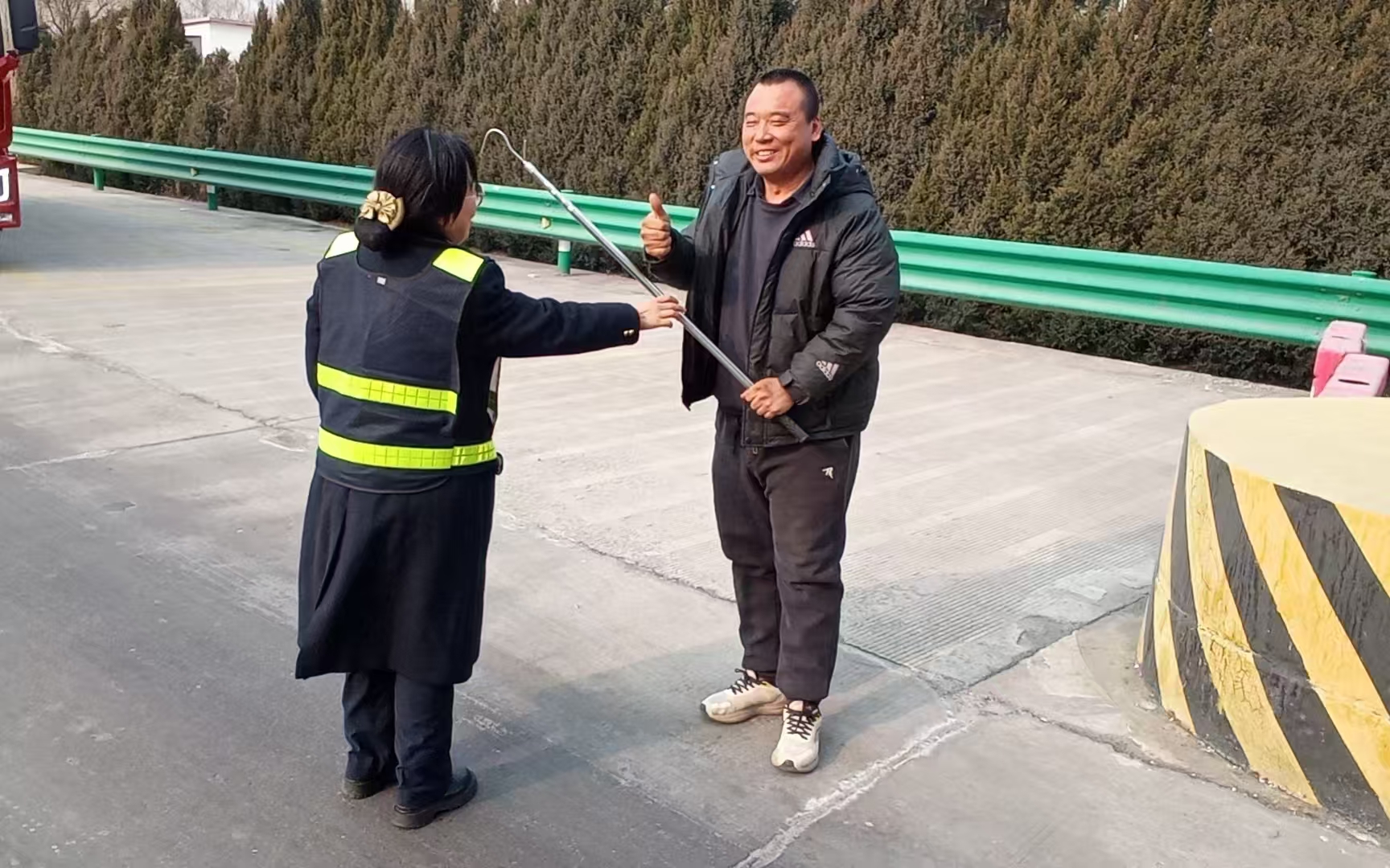 1月28日,固安东收费站收费班组在完成绿通车辆查验工作后,发现车道内有一根货车篷布撑杆遗落。收费员发现后第一时间按流程上报情况,并迅速通过车辆登记信息,成功联系上冀B牌照的货车司机。