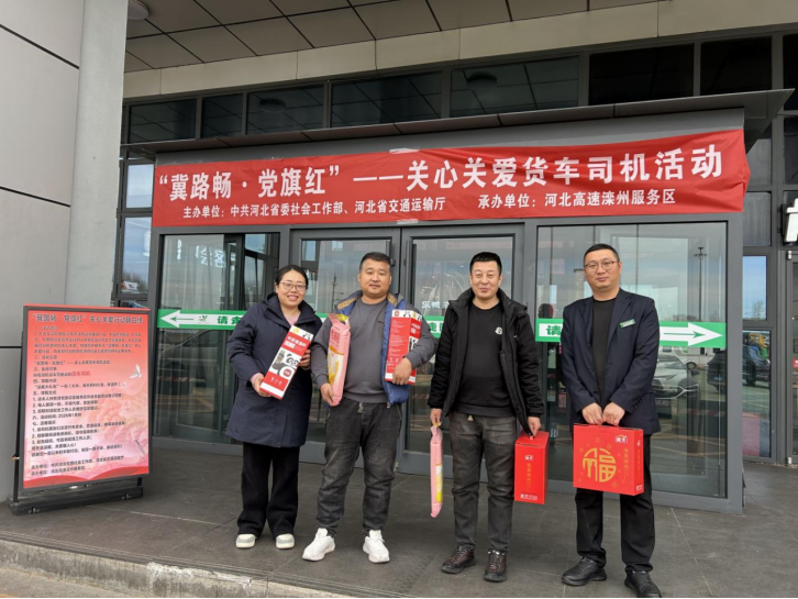 滦州服务区承办了由中共河北省委社会工作部、省交通运输厅联合发起的“冀路畅·党旗红”关心关爱货车司机行动,为过往货车司机发放精心准备的“温暖大礼包”,让“党旗红”始终飘扬在保障“冀路畅”的第一线。