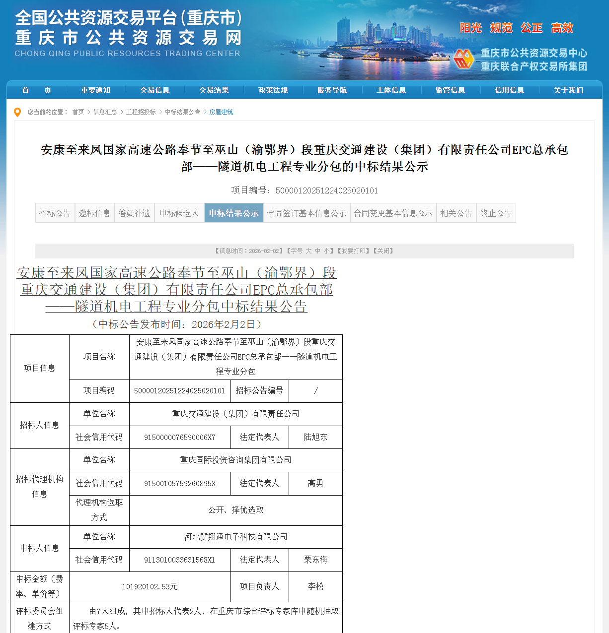 1月26日,重庆安康至来凤国家高速公路奉节至巫山(渝鄂界)段隧道机电工程专业分包项目正式开标,经过评审,冀翔通公司以1.019亿元成功中标该项目,这是冀翔通公司取得公路机电工程专业承包一级资质后中标的首个外省且金额突破亿元的重大项目,具有重要意义。