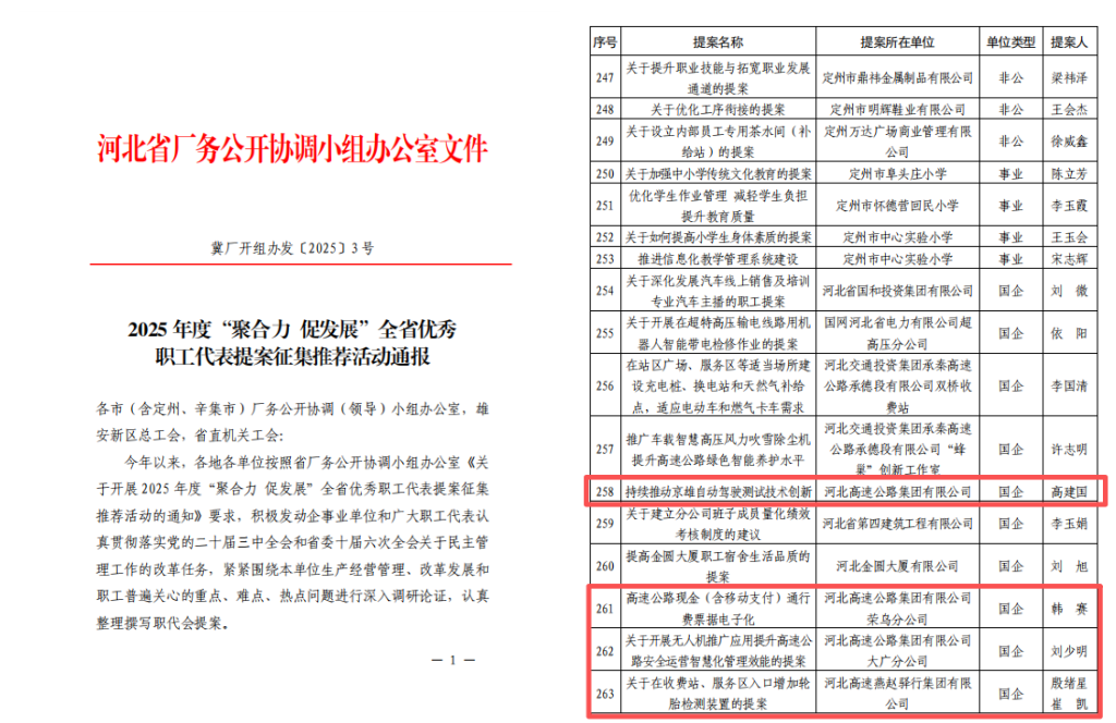 此外,在河北省2025年度“聚合力 促发展”全省优秀职工代表提案征集推荐活动中,集团工会选送的4项职工代表提案均受到通报表彰。