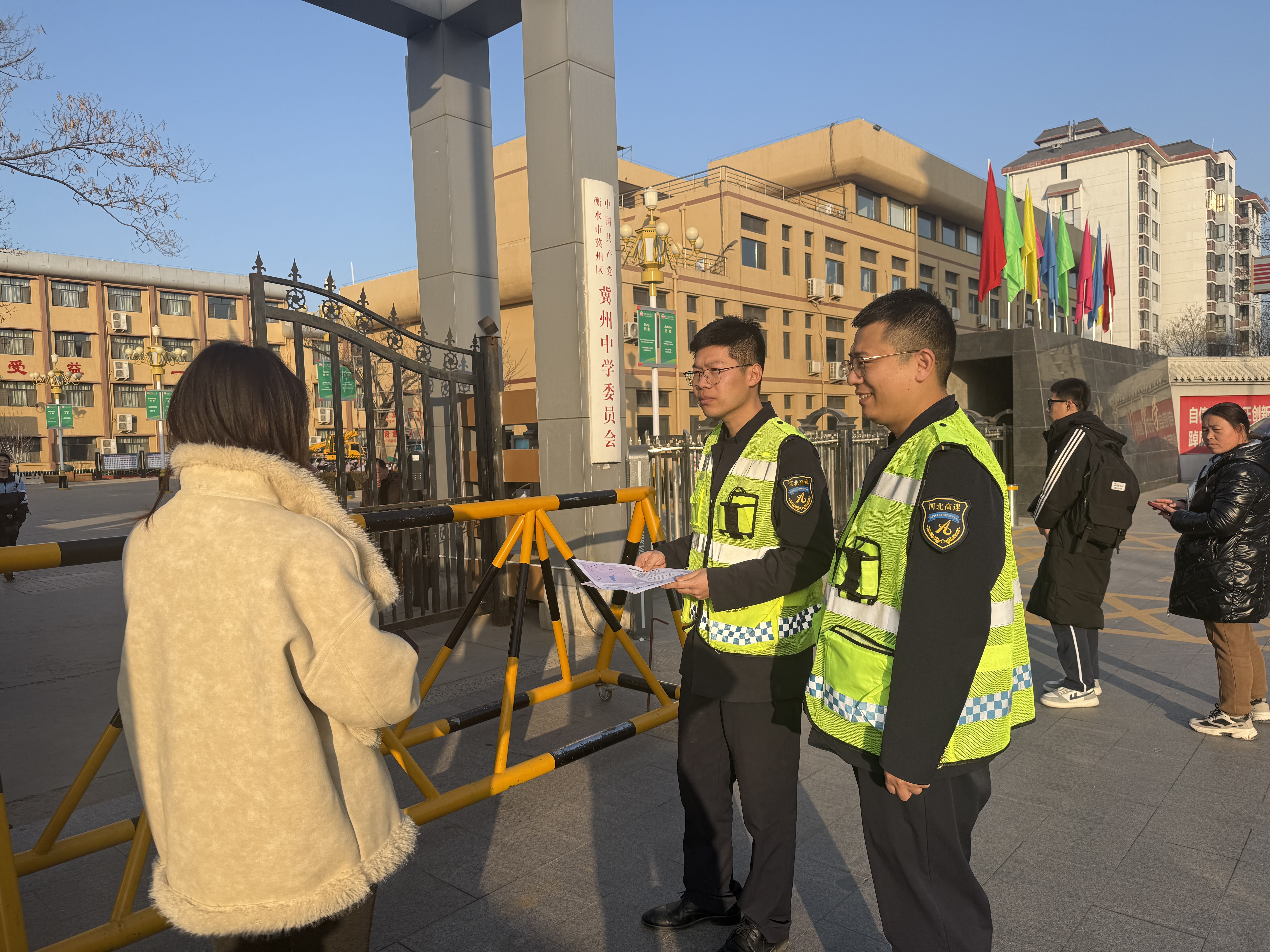 在冀州中学、冀州长乐中学、冀州滏运中学、冀州富宁中学,工作人员详细介绍冀州西收费站春运保畅服务举措,会根据学子集中放假时段增开收费车道,专门设置“学子春运绿色通道”,安排专人引导接送学生车辆快速通行,动态调整疏导方案,缓解春运车流与返校车流叠加带来的拥堵压力;同时将升级便民服务,为学子及家长提供路线咨询、临时休息、应急帮扶等暖心服务,缓解春运出行疲惫。校方及在场学生家长纷纷对冀州西收费站的暖心服务表示称赞。