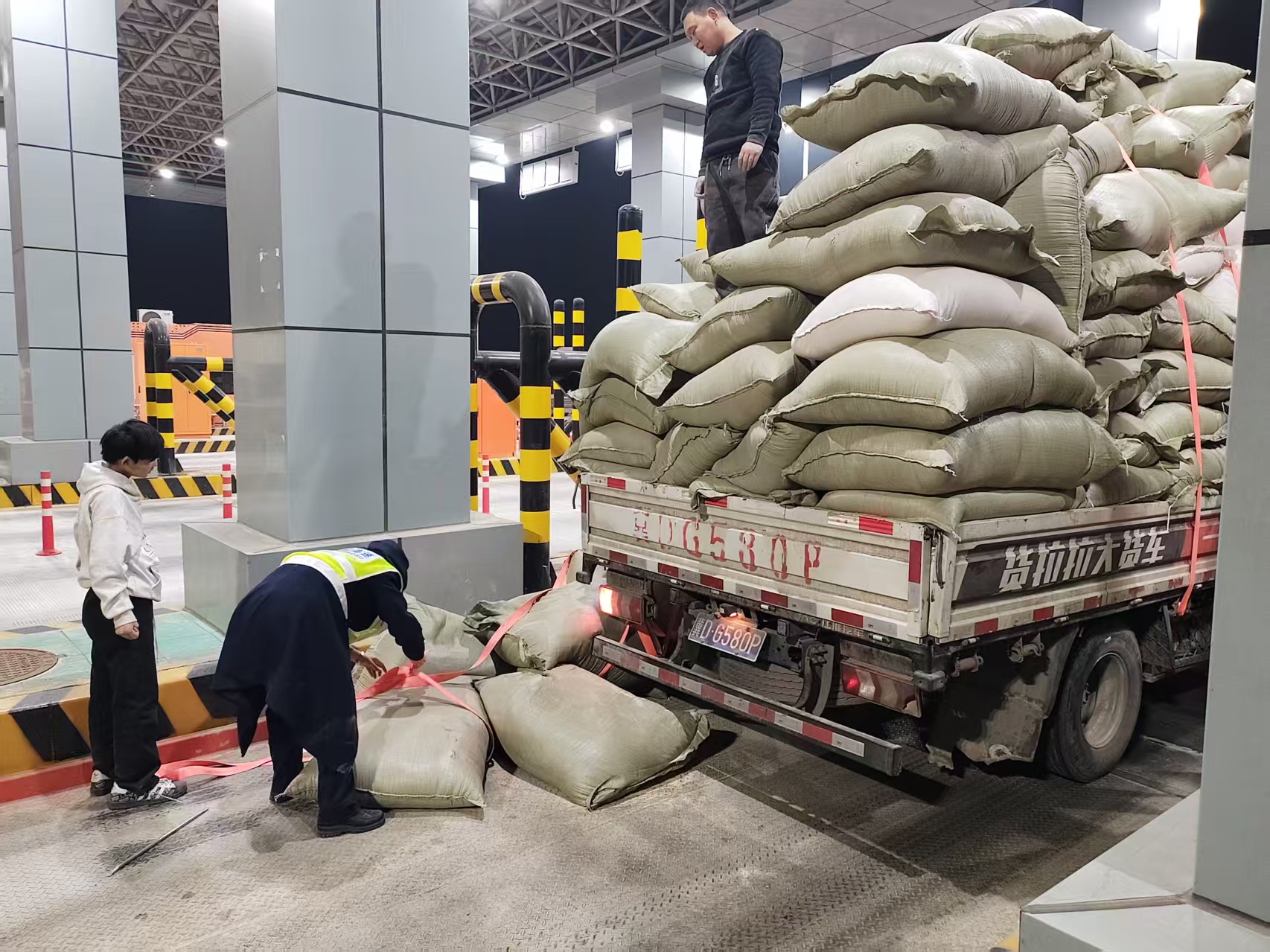 见此情景,当班收费员杜彦彦立即来到车道,摆放好安全锥做好安全提示,将其他车辆疏导至其它车道通行。随后,她一边安慰司机一边叫来当班其它人员。在冬日的寒风里,大家齐心协力,共同把散落的货物装起并固定好,司机师傅连连道谢后安全驶离。
