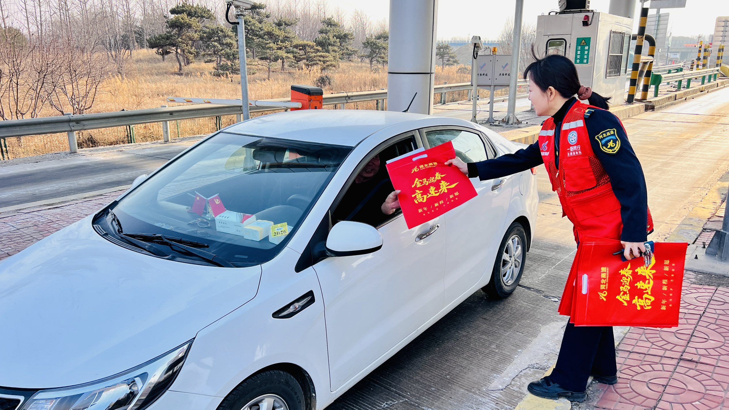 节前,站区全面整治环境卫生,挂起灯笼、贴上福字,年味一下子浓了起来。活动当天,收费员们换上整齐制服,手拿新春礼包,笑着递给过往司机:“小年安康”“一路平安”“马年大吉”——一句句实在的问候,一副副红彤彤的春联,让赶路的人停了车也暖了心。
