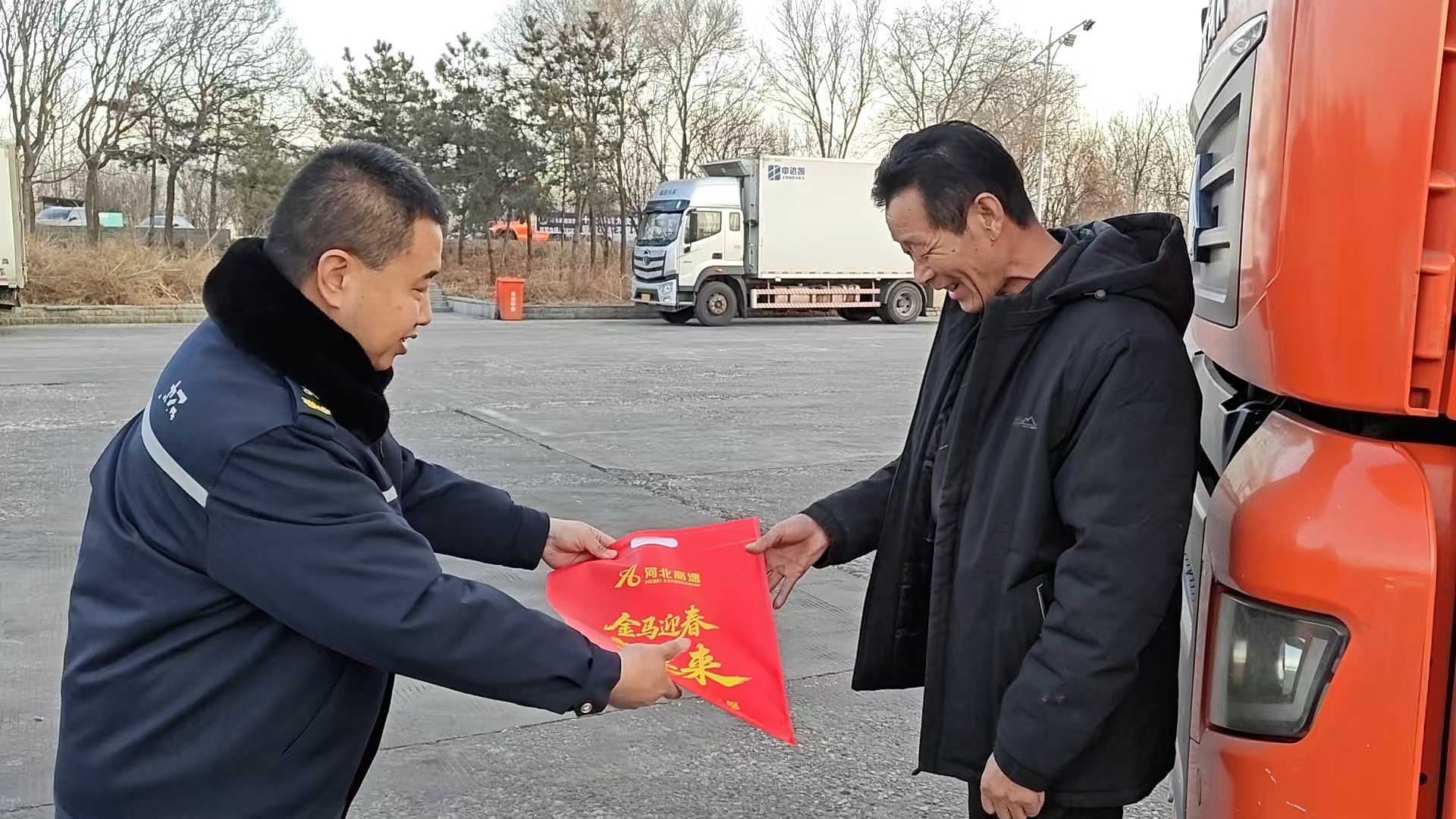 随后,党员志愿者们赶到廊坊服务区。他们主动招呼过往司乘,引导车辆有序停靠后,微笑着递上春联,并送上新春祝福。在发放春联的过程中,他们结合实际案例,向不同类型车辆的司乘人员宣传春运行车安全知识。